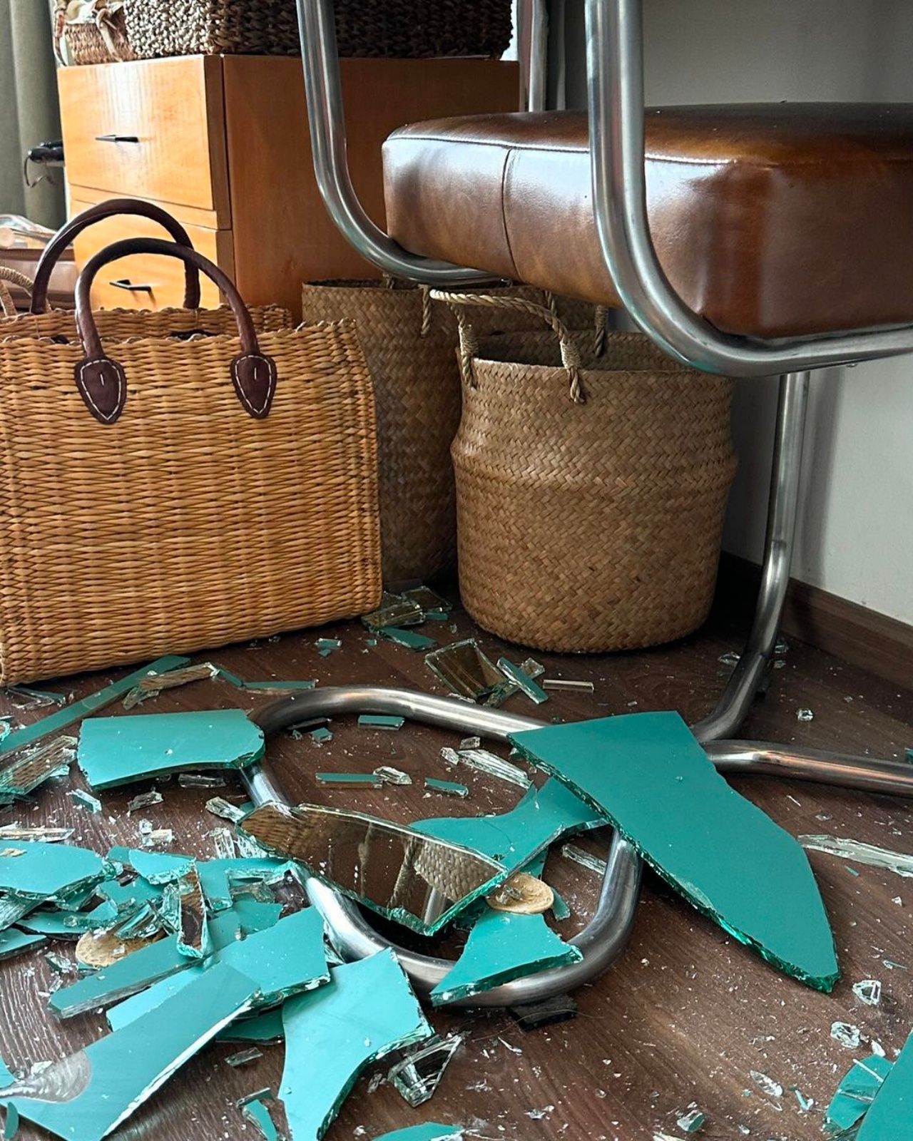ซึ่ง อาย ได้โพสต์ภาพพร้อมเขียนข้อความว่า "ไม่อยู่บ้าน 21 วัน กลับมากระจกแหลก พื้นเป็นรอยเละตุ้มเป๊ะ น่าจะร้อนจัด กาวละลาย น่ากลัวมาก เศษกระจกทั้งใหญ่ทั้งเล็ก กระจายเต็มห้อง และข้าวของเครื่องใช้ เตียง โซฟา พรม ไปถึงหมด ไกลไปถึงทางเดิน ไม่อยากจะนึกสภาพตอนมันตกลงมา คลีนกันอยู่นานแบบไม่ให้เหลือเศษกระจก เล่นแสงวิบวับเต็มพื้นไปหมดแล้ว ว่าแต่ กระจกที่แตกไป จะเอาไงดี ติดแบบเดิมก็กลัว เอาจริง"