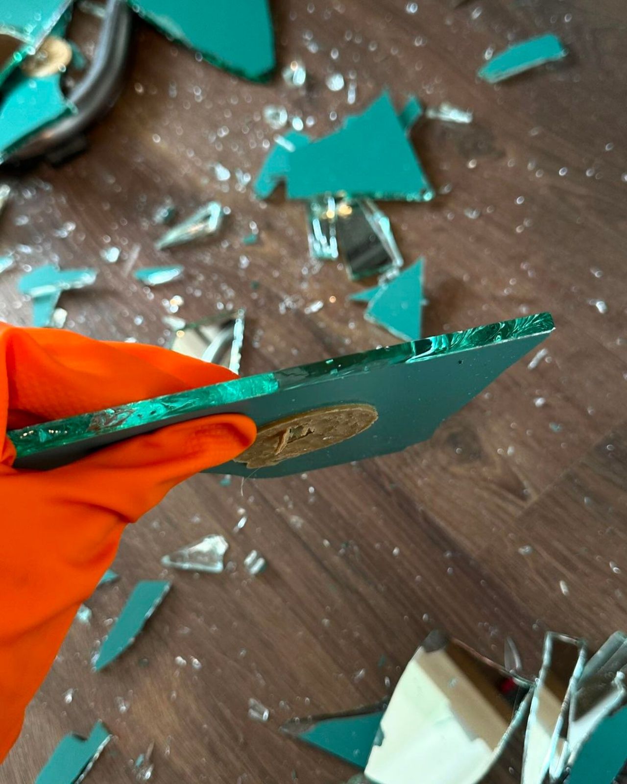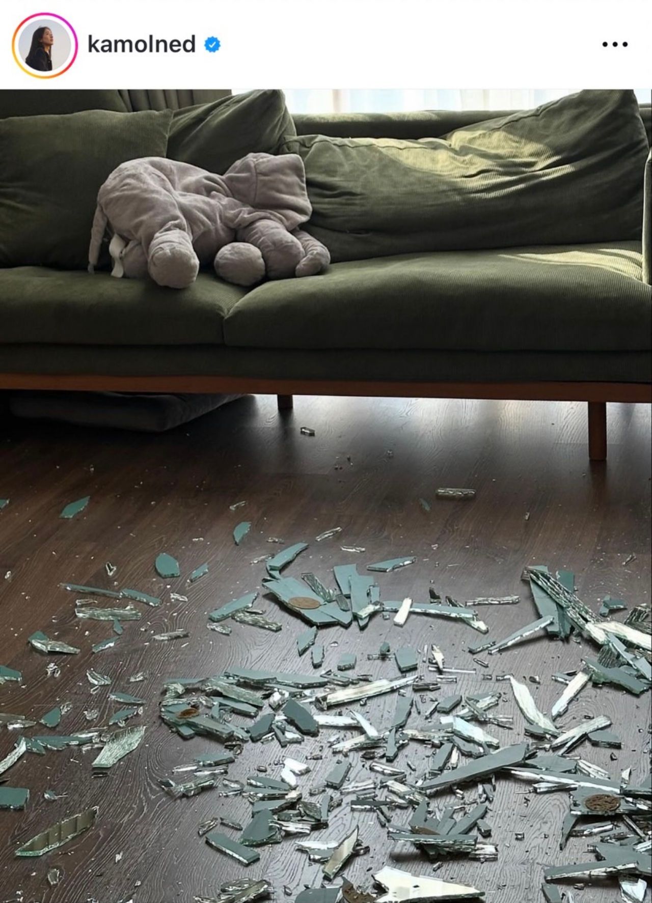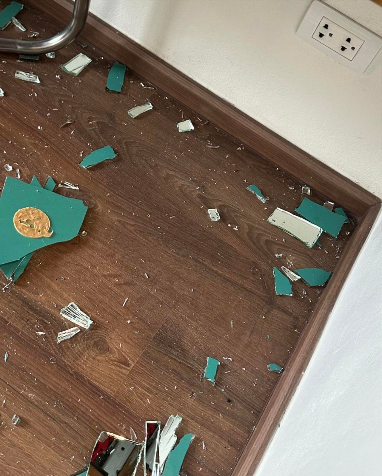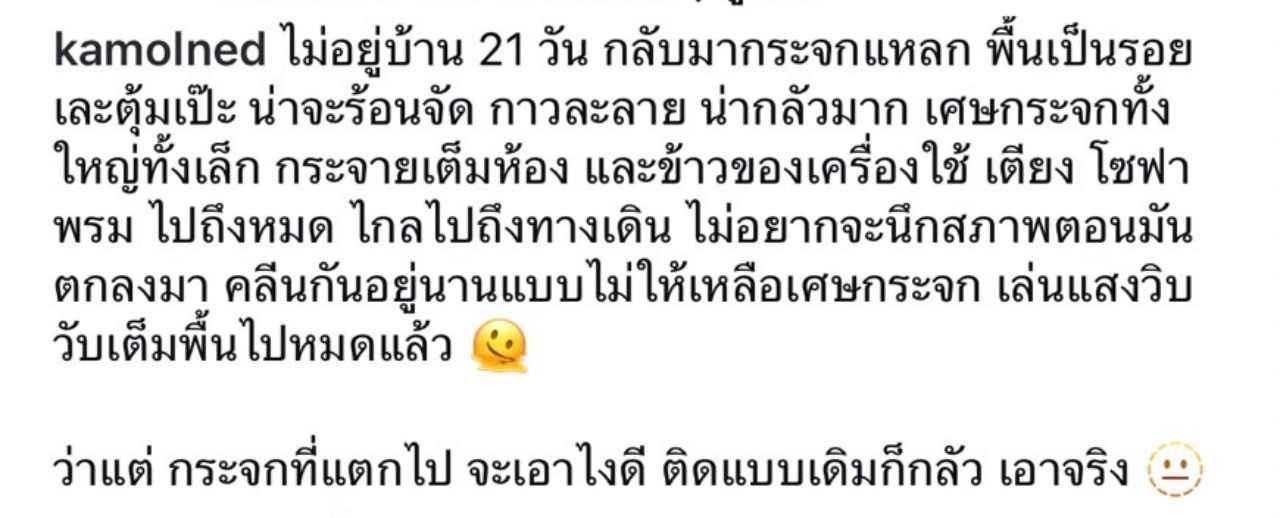 ทำเอาสาว อาย กมลเนตร ถึงกับช็อกเลยทีเดียว หลังจากที่ไปเที่ยวมา ไม่อยู่บ้าน 21 วัน แต่พอเปิดเข้ามาเจอเศษกระจกแตกกระจายอยู่เต็มห้อง พื้นเป็นรอยเละ ซึ่งเบื้องต้นยังไม่ทราบสาเหตุที่แน่ชัดว่าเกิดอะไรขึ้น แต่คิดว่าน่าจะเกิดจากกาวละลายเพราะอากาศร้อนมาก หรือกาวที่ยึดติดน่าจะน้อยเกินไป เลยทำให้กระจกตกลงมา
