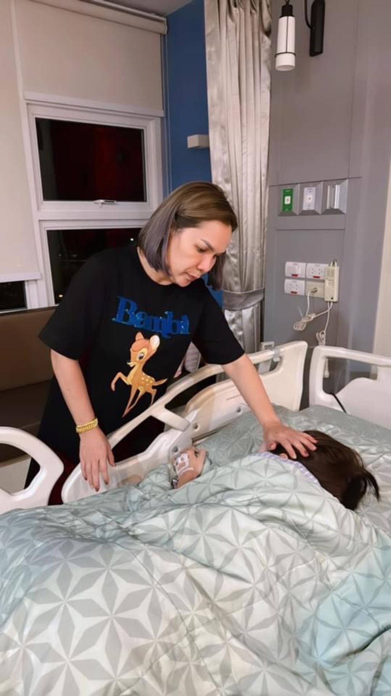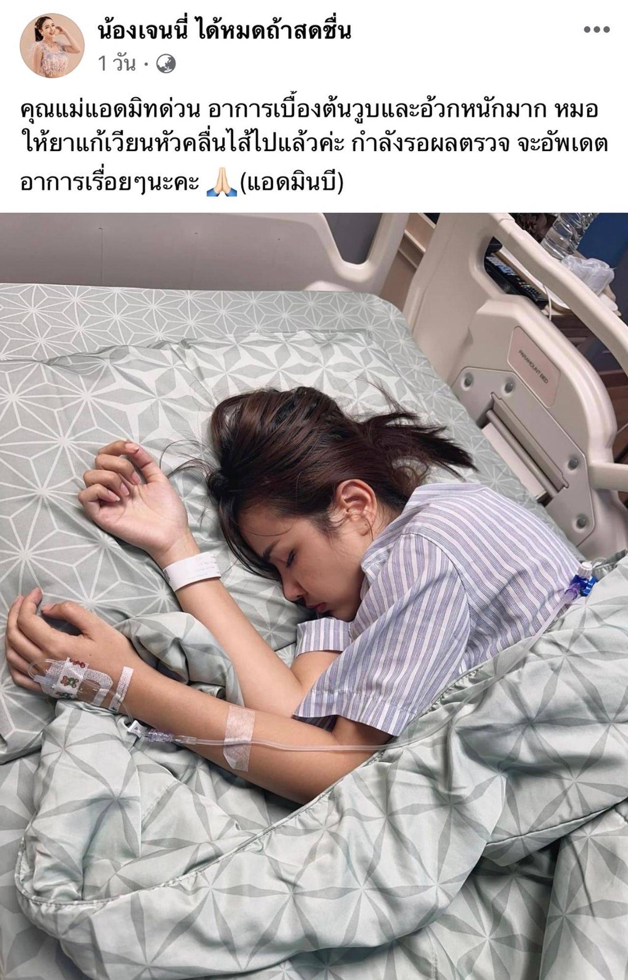 "คุณแม่แอดมิตด่วน อาการเบื้องต้นวูบและอ้วกหนักมาก หมอให้ยาแก้เวียนหัวคลื่นไส้ไปแล้วค่ะ กำลังรอผลตรวจ จะอัปเดตอาการเรื่อยๆ นะคะ"