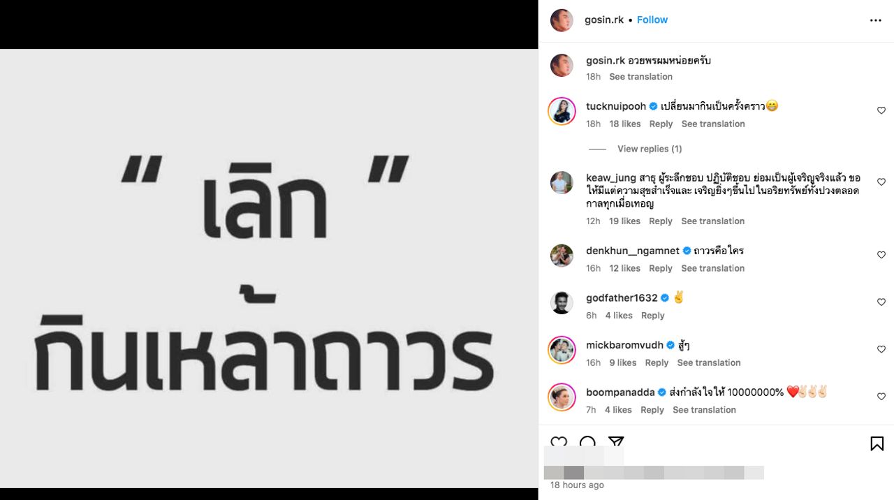 ทำเอาเพื่อนๆ ทั้งในและนอกวงการบันเทิง รวมไปถึงแฟนๆ เข้ามาคอมเมนต์กันรัวๆ เมื่อนักแสดงหนุ่ม โก โกสินทร์ ได้ประกาศกลางอินสตาแกรมของตัวเองเอาไว้ว่า "เลิก กินเหล้าถาวร" พร้อมระบุแคปชั่นว่า "อวยพรผมหน่อย"