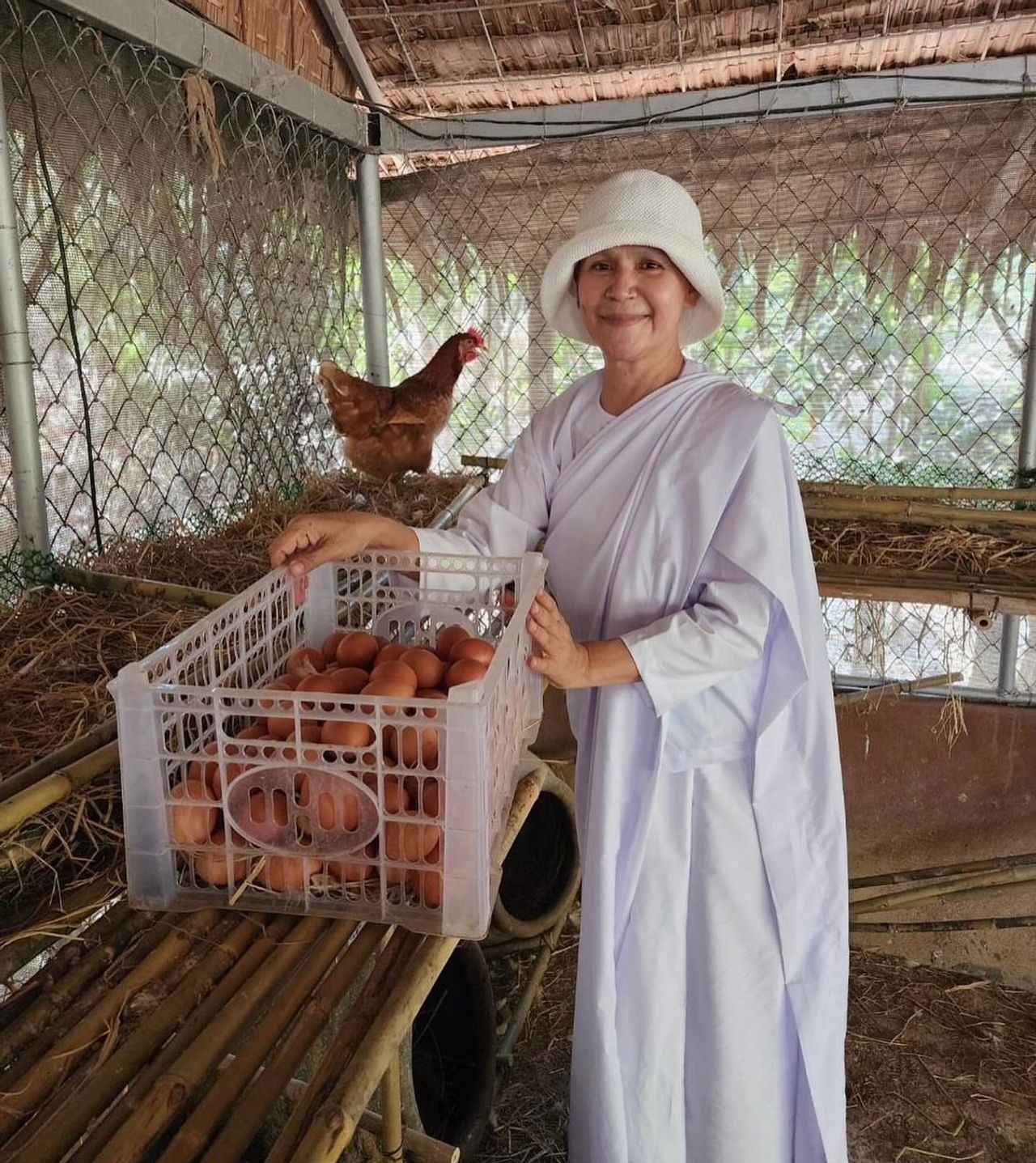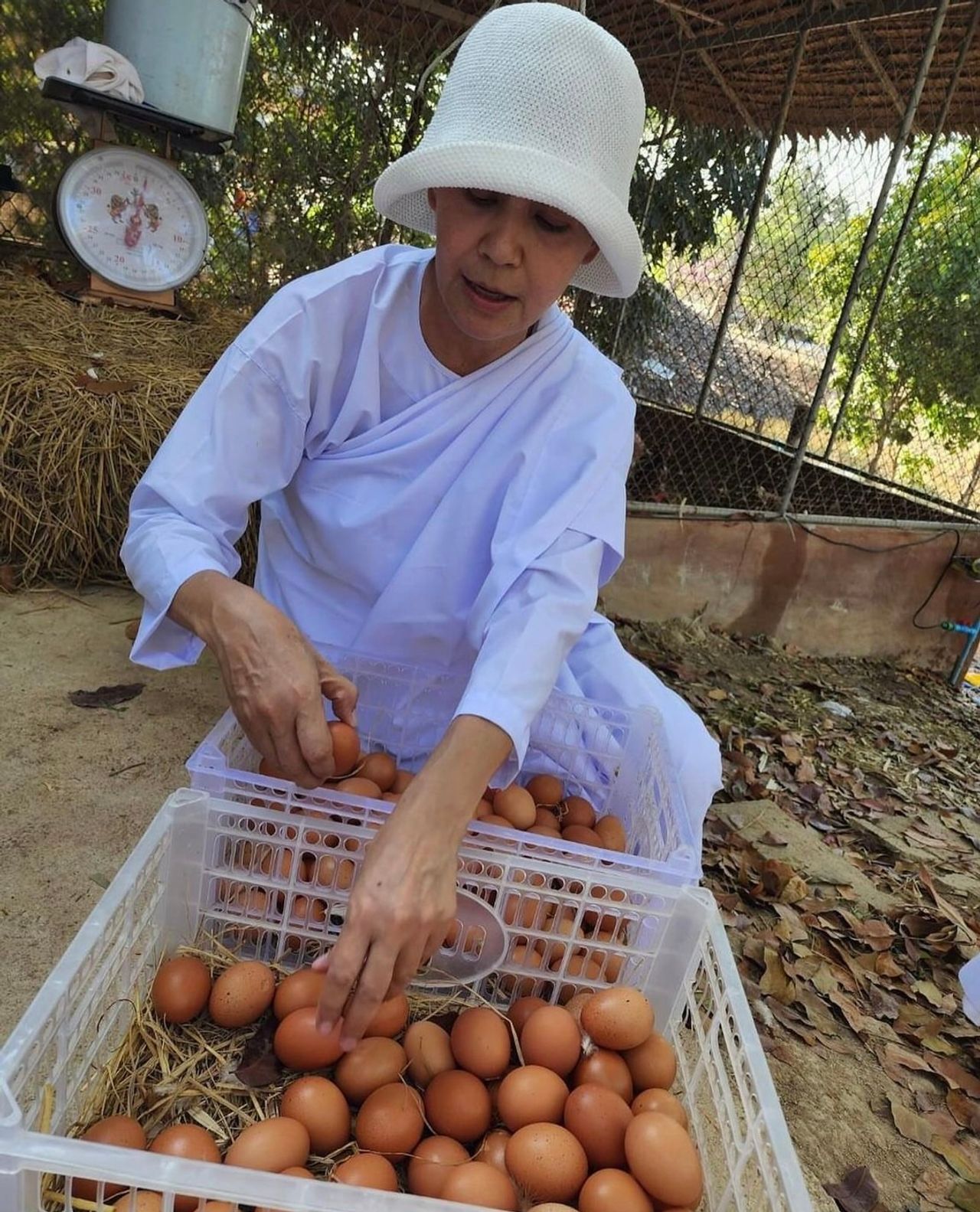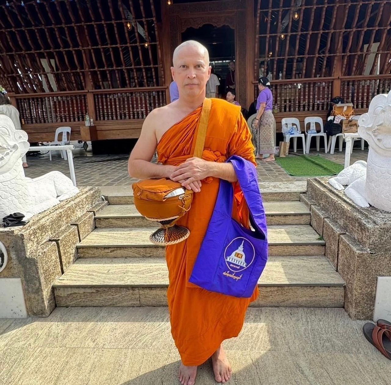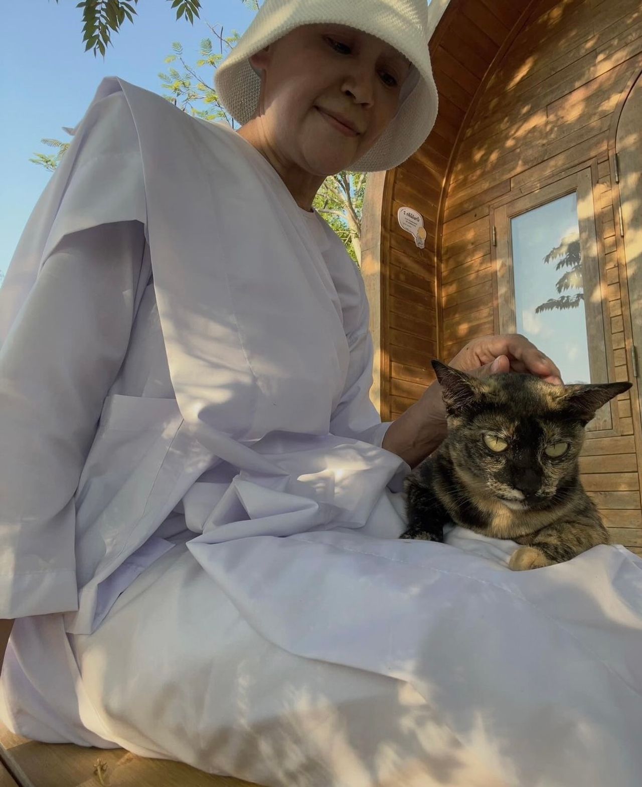 พร้อมแคปชั่น "ลาสิกขา ออกมา ส่งต่อการไป บวชปฏิบัติ วันนี้ปลงผม พรุ่งนี้เดินทางไปบวชเป็นพระภิกษุ ที่ศรีลังกา ขอให้ความตั้งใจนี้สมดั่งที่ตั้งมั่น ขออนุโมทนาสาธุด้วยค่ะ เราจะเกื้อหนุนกันในธรรม ในชีวิต อย่างคู่ชีวิตและกัลยาณมิตรต่อกัน"