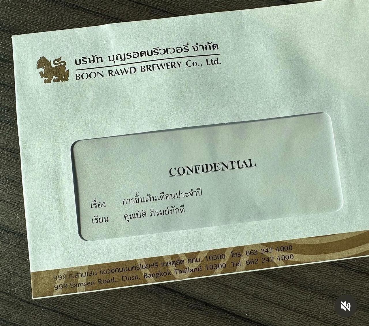 ที่ระบุว่า "CONFIDENTIAL" (ลับ) บนหน้าซองของเอกสารดังกล่าวมีข้อความระบุว่า "เรื่อง การขึ้นเงินเดือนประจำปี" และ "เรียน คุณปิติ ภิรมย์ภักดี" ซึ่งทาง ต๊อด ปิติ ก็ได้ลงแคปชั่นเป็นอีโมจิหน้ายิ้มพร้อมหัวใจ 3 ตัว แสดงถึงความแฮปปี้สุดๆ ไปเลย.
