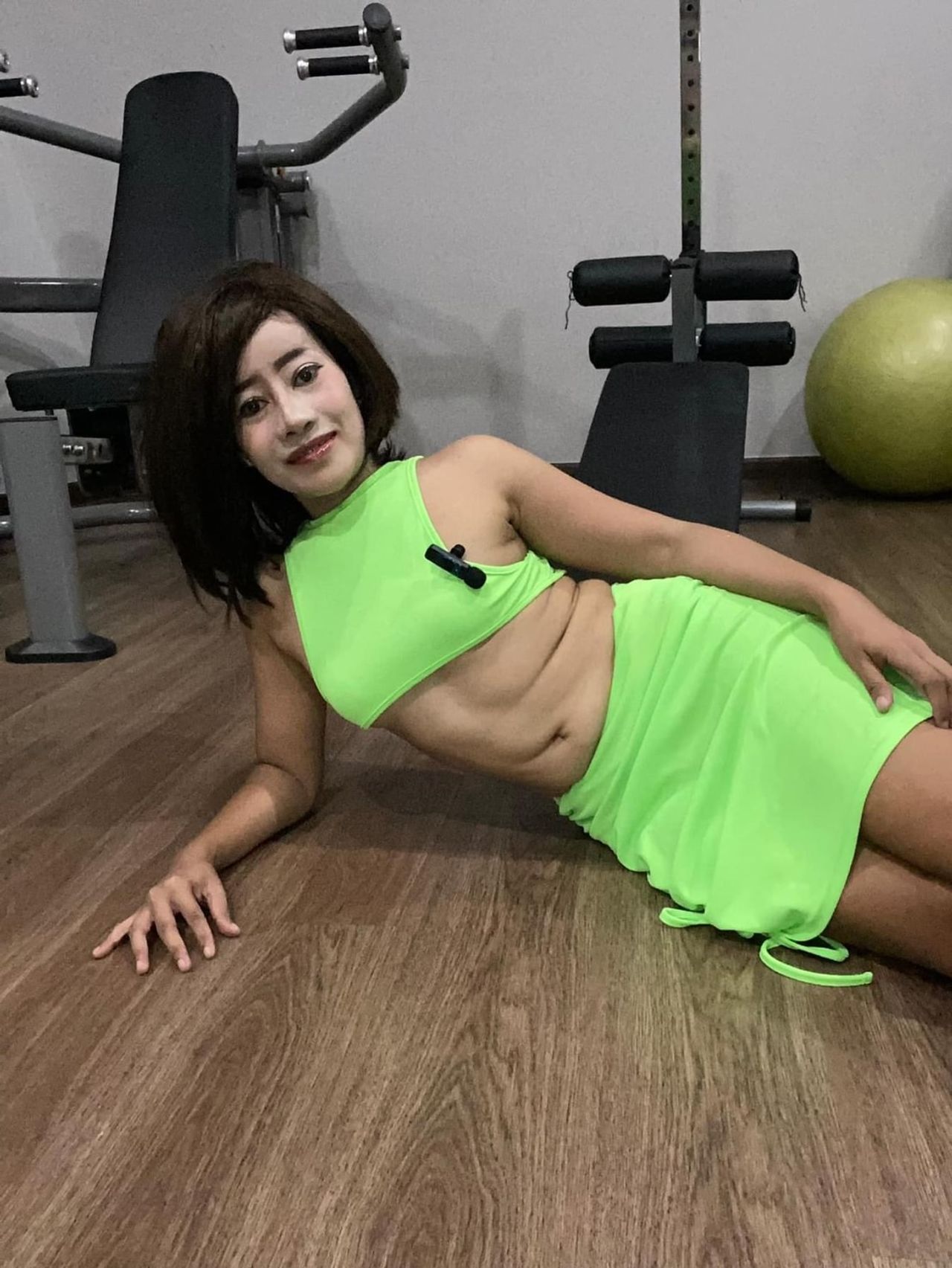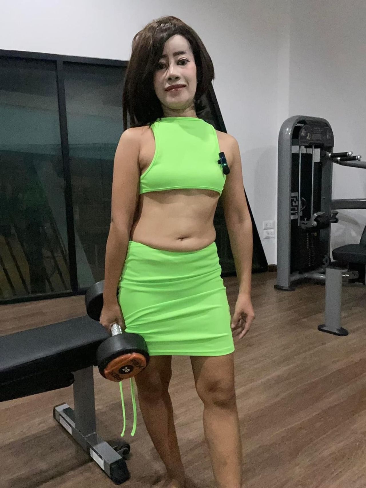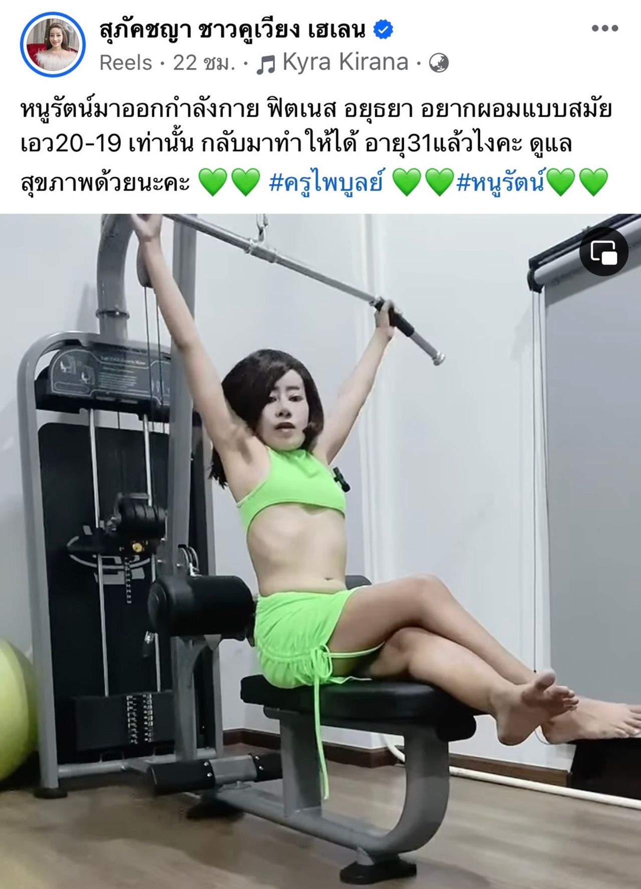 "วันนี้มาออกกำลังกาย อยากผอม เอว 20 ค่ะ ดูแลหุ่นความสวยค่ะ ขอบคุณค่ะ" พร้อมลงรูปตัวเองใส่ชุดเอวลอยสีเขียวสะท้อนแสง โพสท่าในอิริยาบถท่าออกกำลังกาย