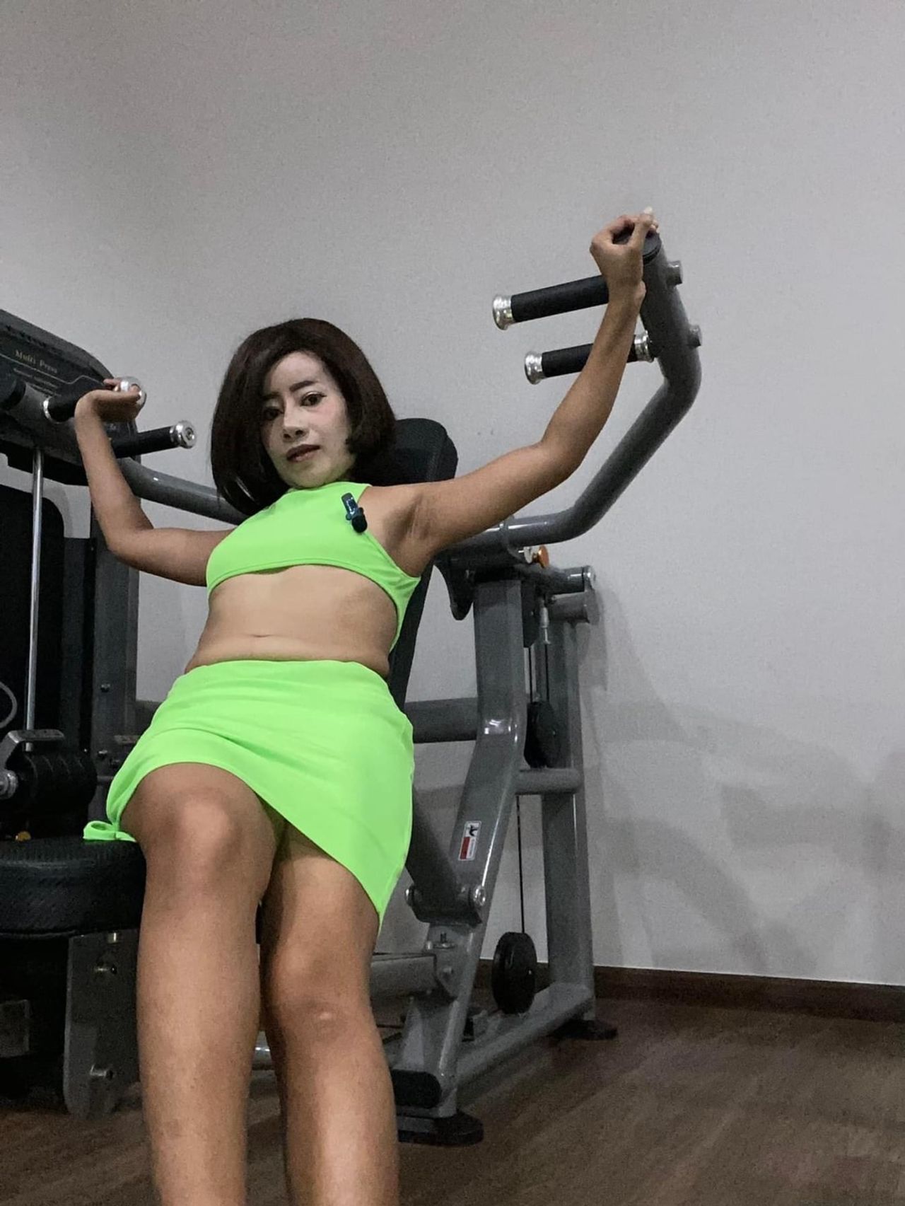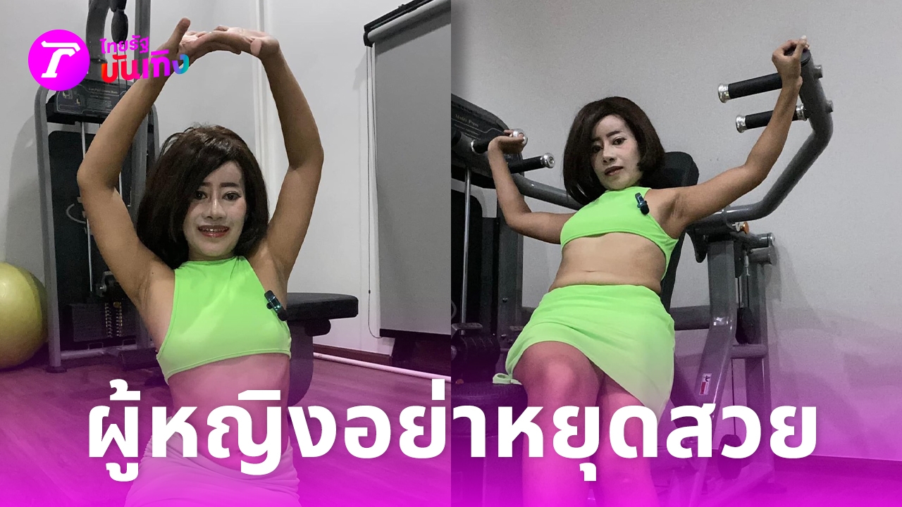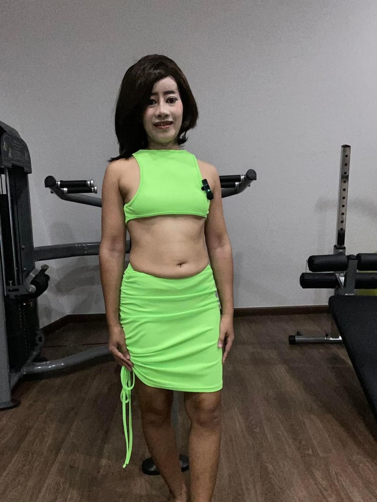 "วันนี้มาออกกำลังกาย อยากผอม เอว 20 ค่ะ ดูแลหุ่นความสวยค่ะ ขอบคุณค่ะ" พร้อมลงรูปตัวเองใส่ชุดเอวลอยสีเขียวสะท้อนแสง โพสท่าในอิริยาบถท่าออกกำลังกาย