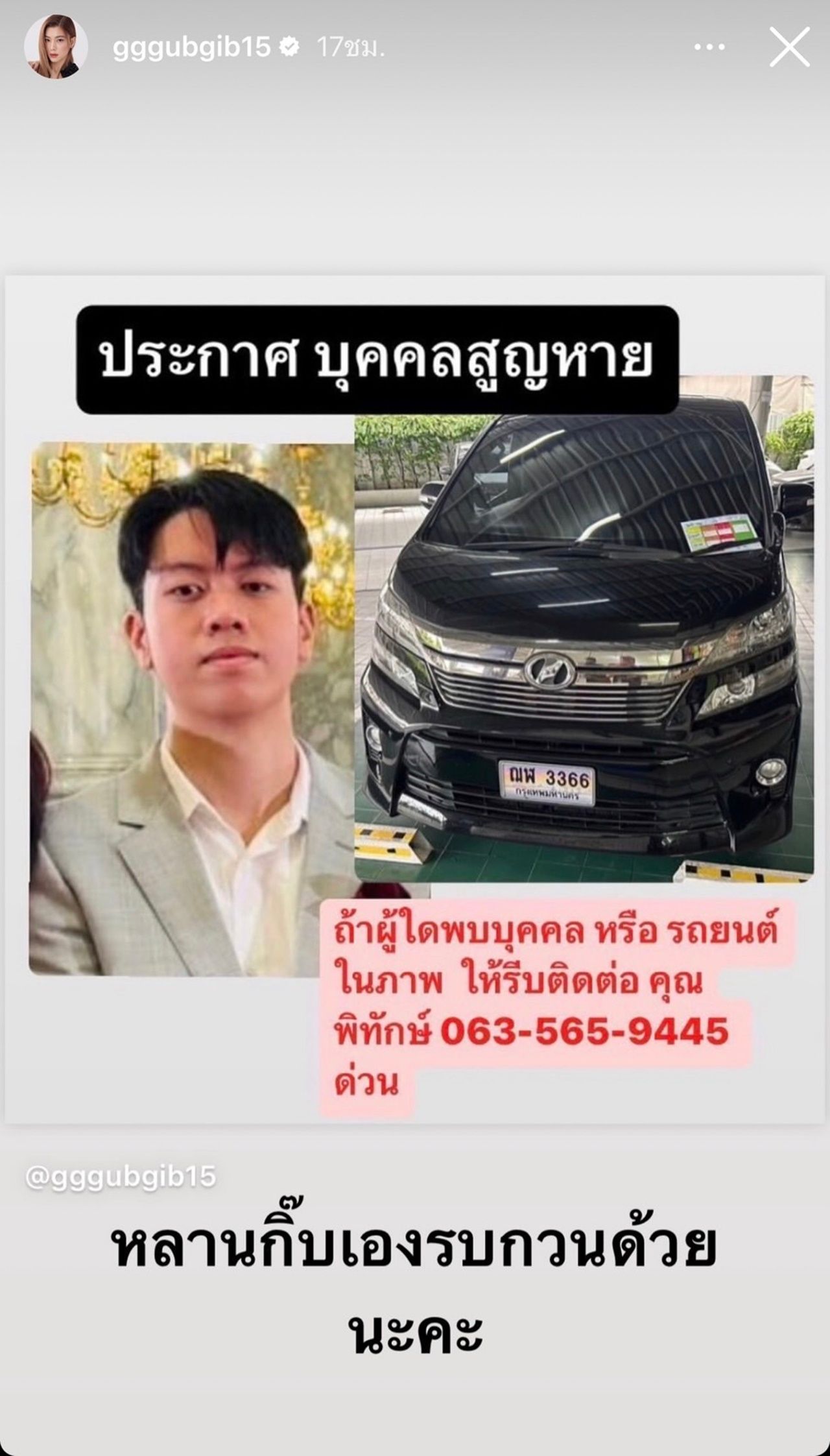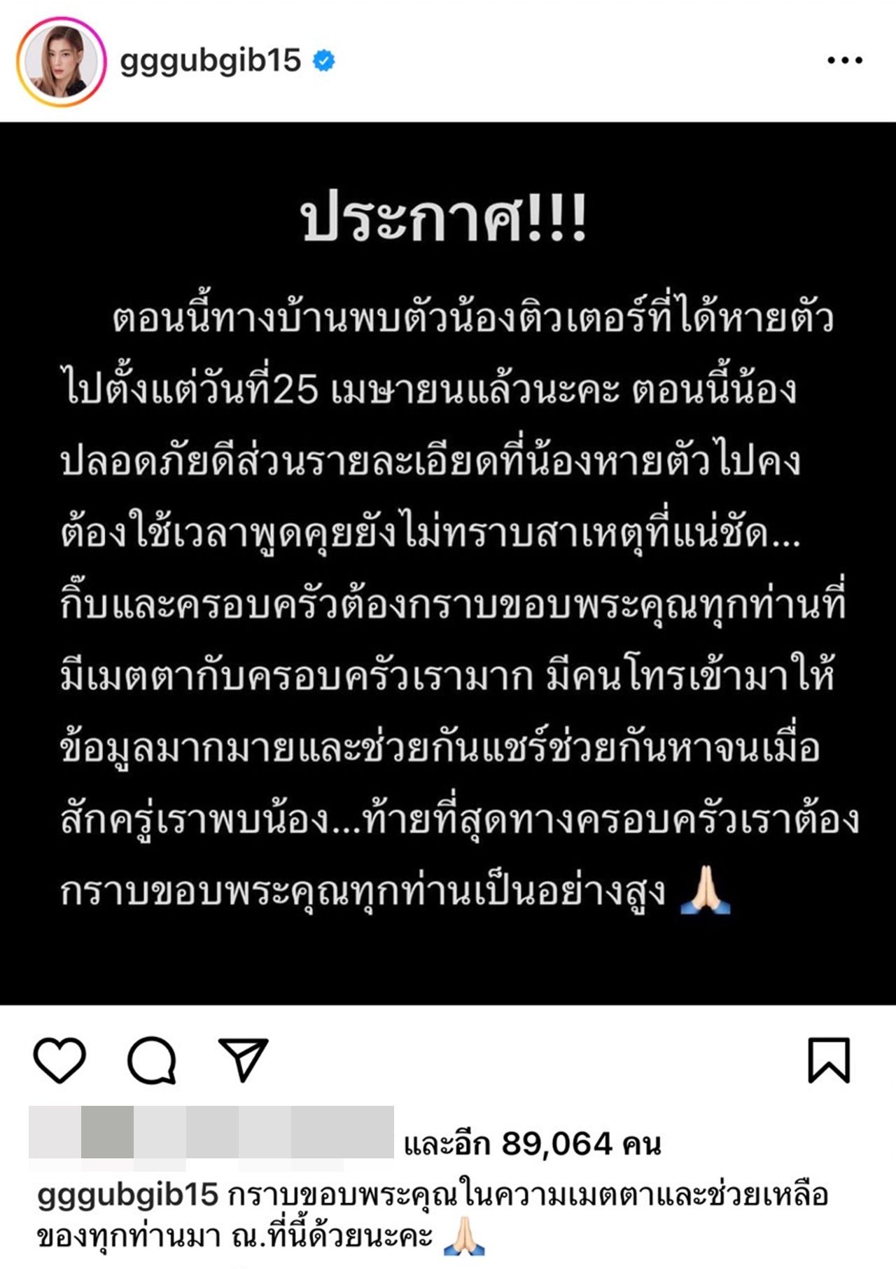 กิ๊บและครอบครัวต้องกราบขอบพระคุณทุกท่านที่ มีเมตตากับครอบครัวเรามาก มีคนโทรเข้ามาให้ ข้อมูลมากมายและช่วยกันแชร์ช่วยกันหาจนเมื่อ สักครู่เราพบน้อง...ท้ายที่สุดทางครอบครัวเราต้อง กราบขอบพระคุณทุกท่านเป็นอย่างสูง".