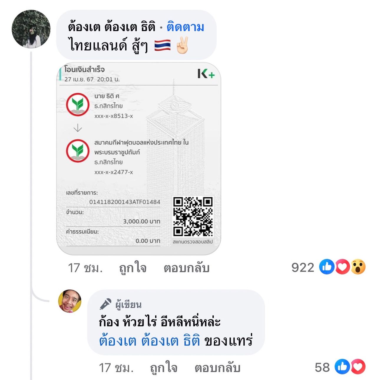 และในคอมเมนต์ ผู้กำกับชื่อดัง ต้องเต ธิติ ก็ได้แปะสลิปร่วมบริจาคไว้ด้วยเช่นกัน และยังมีแฟนๆ เข้ามาโชว์สลิปเงินให้ได้เห็นว่าพร้อมใจกันซัพพอร์ตนักกีฬาไทยกันเต็มที่.