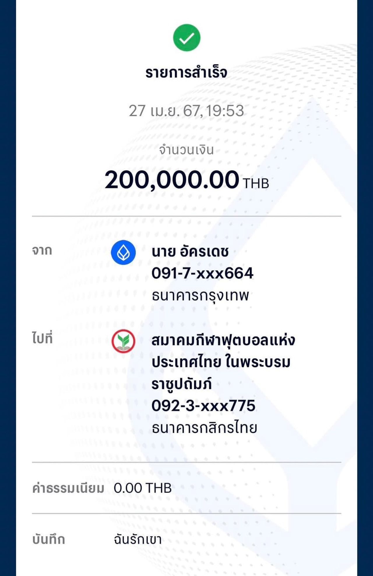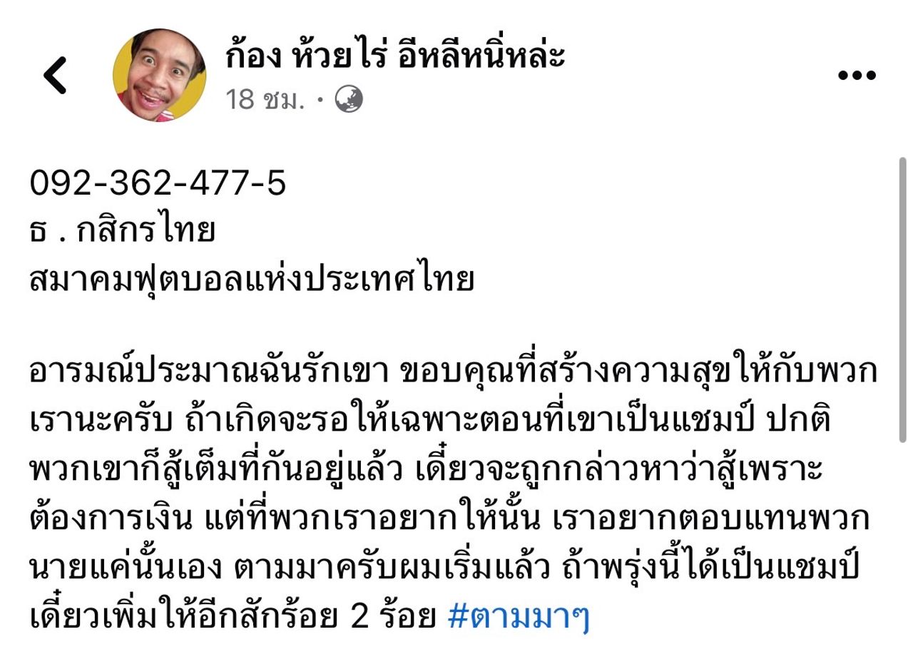 "092-362-477-5 ธ. กสิกรไทย สมาคมฟุตบอลแห่งประเทศไทย อารมณ์ประมาณฉันรักเขา ขอบคุณที่สร้างความสุขให้กับพวกเรานะครับ ถ้าเกิดจะรอให้เฉพาะตอนที่เขาเป็นแชมป์ ปกติพวกเขาก็สู้เต็มที่กันอยู่แล้ว เดี๋ยวจะถูกกล่าวหาว่าสู้เพราะต้องการเงิน