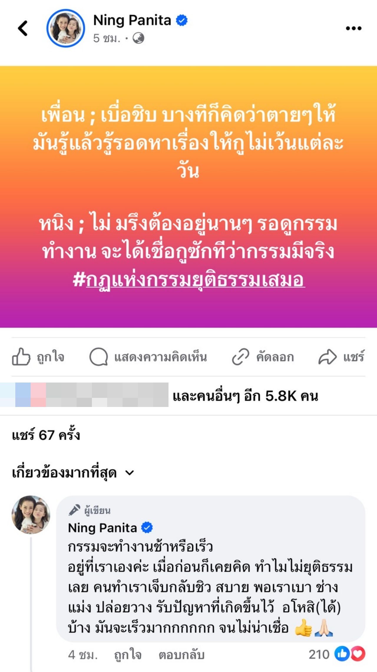 จากนั้นก็ได้เขียนข้อความเพิ่มเติมว่า "กรรมจะทำงานช้าหรือเร็ว อยู่ที่เราเองค่ะ เมื่อก่อนก็เคยคิด ทำไมไม่ยุติธรรมเลย คนทำเราเจ็บกลับชิว สบาย พอเราเบา ช่างแม่ง ปล่อยวาง รับปัญหาที่เกิดขึ้นไว้ อโหสิ(ได้) บ้าง มันจะเร็วมากกกกกก จนไม่น่าเชื่อ"