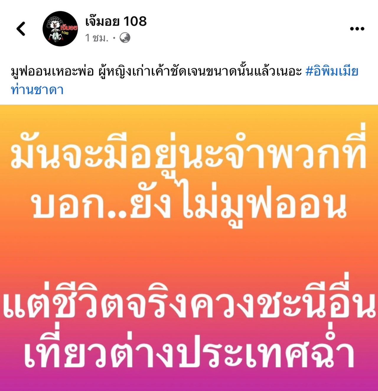 โดย เจ๊มอย ระบุข้อความว่า "มันจะมีอยู่นะจำพวกที่บอกไม่มูฟออน แต่ชีวิตจริงควงชะนีอื่นเที่ยวต่างประเทศฉ่ำ" และ "มูฟออนเหอะพ่อ ผู้หญิงเก่าเค้าชัดเจนขนาดนั้นแล้วเนอะ #อิพิมเมียท่านชาดา"