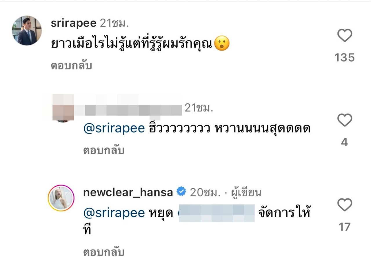 ล่าสุดหลังจากที่ฝ่ายชายสึก นิวเคลียร์ก็ได้ลงรูปคู่กับหนุ่มบ๊อบบี้พร้อมแคปชั่นว่า "ผมยาวกี่โมง..." งานนี้ฝ่ายชายก็ไม่รอช้าเข้ามาคอมเมนต์ว่า "ยาวเมื่อไรไม่รู้แต่ที่รู้รู้ผมรักคุณ" งานนี้ทำเอาเพื่อนๆ แฟนๆ ถึงกับกรี๊ดไม่ไหวกับคอมเมนต์ของฝ่ายชาย เห็นเงียบๆ แบบนี้ แต่ก็หวานไม่เบานะคะคุณ
