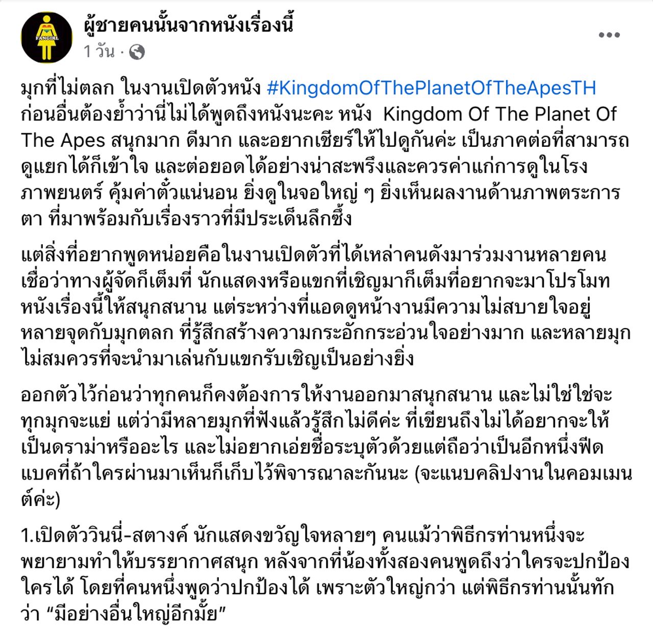โดยเรื่องราวนี้เกิดจากเพจ ผู้ชายคนนั้นจากหนังเรื่องนี้ ได้ขอพูดถึงพฤติกรรมของพิธีกรคนดังกล่าว เป็นการติเพื่อก่อ เพื่อให้ได้มีการปรับปรุงในครั้งต่อไปเอาไว้ว่า (คลิกเพื่ออ่านโพสต์ต้นฉบับ)