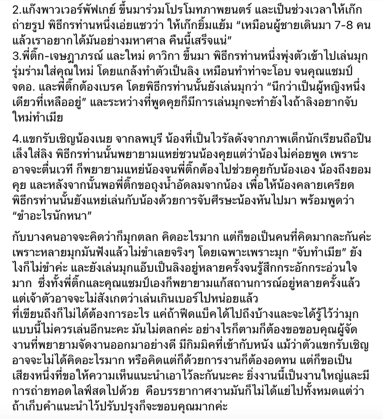 นอกจากนี้ทางเพจก็ยังได้พูดถึงการเล่นมุกที่ไม่ตลกของพิธีกรคนดังอยู่หลายช่วงหลายตอน พร้อมกับยืนยันว่า ที่ออกมานั้นเพราะต้องการที่จะออกมาแนะนำเพื่อให้มีการปรับปรุงนั่นเอง
