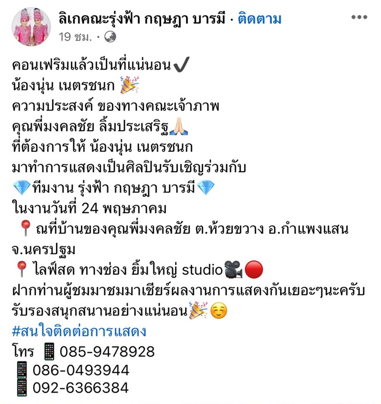 "คอนเฟิร์มแล้วเป็นที่แน่นอน น้องนุ่น เนตรชนก ความประสงค์ ของทางคณะเจ้าภาพ คุณพี่มงคลชัย ลิ้มประเสริฐ ที่ต้องการให้ น้องนุ่น เนตรชนก มาทำการแสดงเป็นศิลปินรับเชิญร่วมกับ ทีมงาน รุ่งฟ้า กฤษฎา บารมี ในงานวันที่ 24 พฤษภาคม ณ ที่บ้านของคุณพี่มงคลชัย ต.ห้วยขวาง อ.กำแพงแสน จ.นครปฐม ไลฟ์สด ทางช่อง ยิ้มใหญ่ studio ฝากท่านผู้ชมมาชมมาเชียร์ผลงานการแสดงกันเยอะๆ นะครับ รับรองสนุกสนานอย่างแน่นอน"