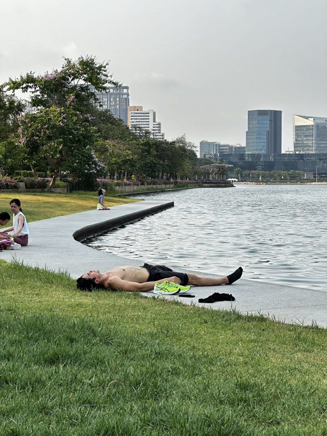 "อันนี้เพิ่งวิ่งเสร็จแล้วเหนื่อย แล้วกำลังยืดเส้นยืดสายอยู่ (คนแตกตื่น?) ผมก็หลับตา แบบพักผ่อน (บางทีกิริยาบางที่ก็แบบ?) เกินไปใช่ไหม (หัวเราะ) มันเป็นสวนสาธารณะไง ก็ทำอะไรแบบสาธารณะได้ (ยิ้ม) เผื่อแผ่สาธารณะ"