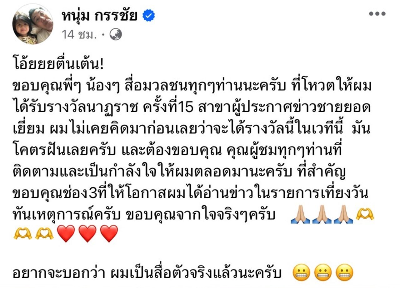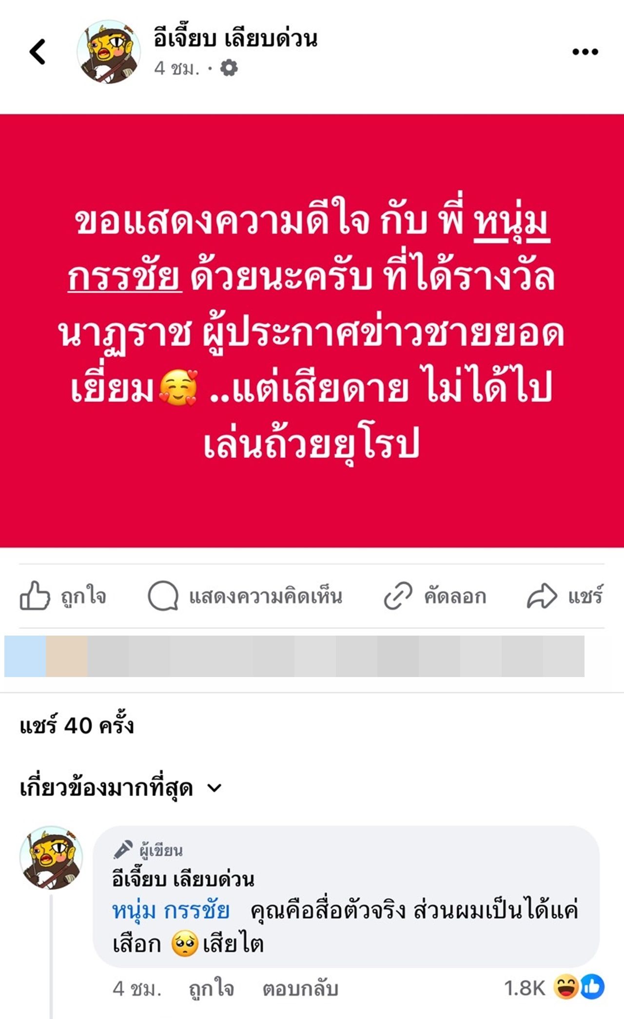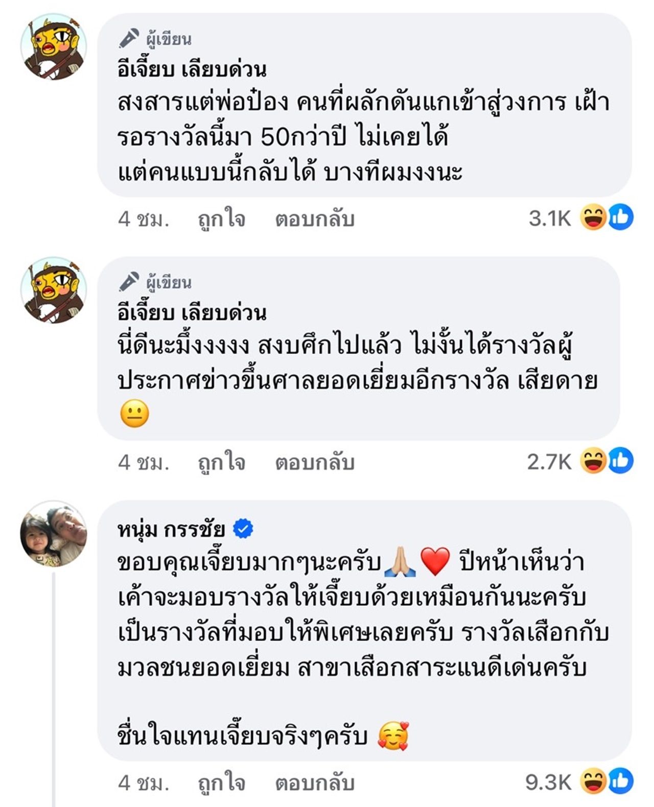 และยังเขียนในคอมเมนต์อีกว่า "หนุ่ม กรรชัย คุณคือสื่อตัวจริง ส่วนผมเป็นได้แค่เสือก เสียไต, สงสารแต่พ่อป๋อง คนที่ผลักดันแกเข้าสู่วงการ เฝ้ารอรางวัลนี้มา 50 กว่าปี ไม่เคยได้ แต่คนแบบนี้กลับได้ บางทีผมงงนะ, นี่ดีนะมึ้งงงงง สงบศึกไปแล้ว ไม่งั้นได้รางวัลผู้ประกาศข่าวขึ้นศาลยอดเยี่ยมอีกรางวัล เสียดาย"