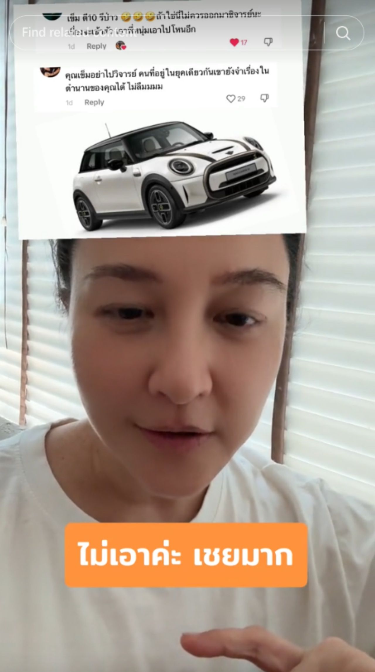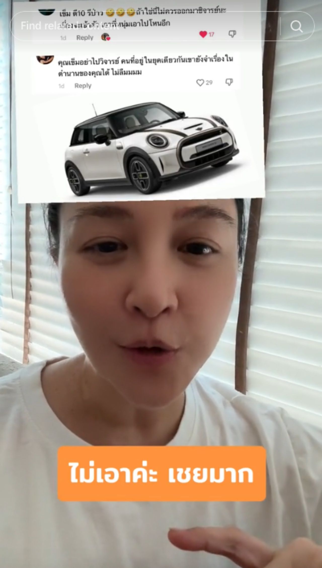 คนที่ 2 ค่ะ "คุณเข็มอย่าไปวิจารณ์เลย คนที่อยู่ในยุคเดียวกัน เขายังจำเรื่องในตำนานของคุณได้ไม่ลืมมมม" ตำนานอะไรเหรอคะ รถที่เข็มเอามาแปะเนี่ย เป็นรถมินิไฟฟ้า เข็มใช้อยู่ปัจจุบันค่ะ แล้วก็จะมีคนคอมเมนต์ในแพลตฟอร์มอื่นนะ ทำไมกล้าใช้มินิ แล้วทำไมจะต้องไม่กล้า ไม่เข้าใจอะ