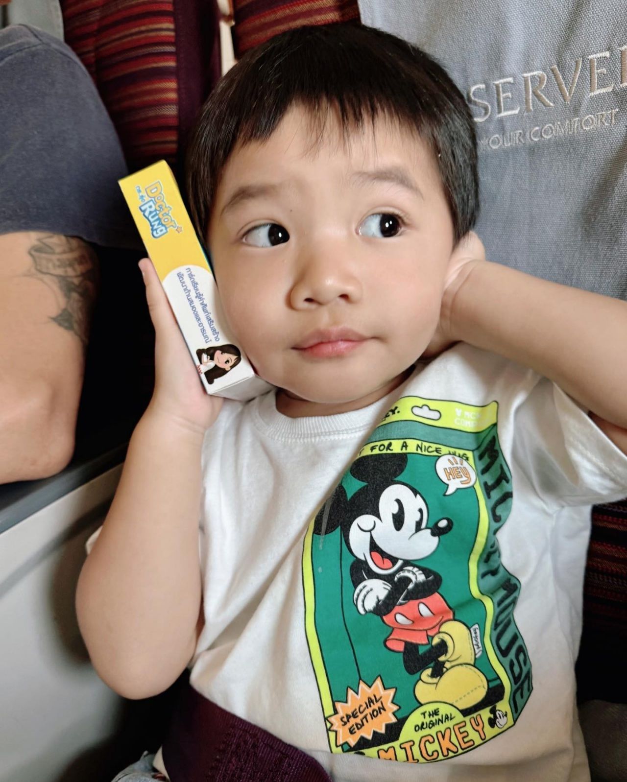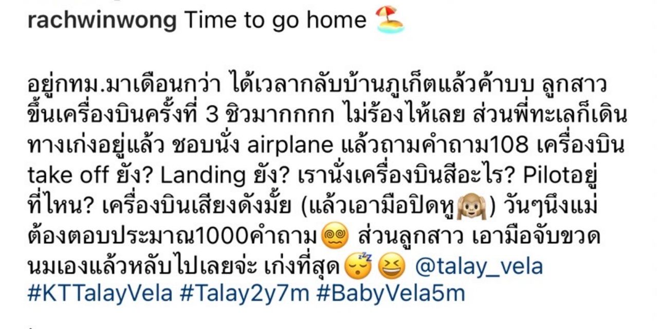 "Time to go home อยู่ กทม.มาเดือนกว่า ได้เวลากลับบ้านภูเก็ตแล้วค้าบบ ลูกสาวขึ้นเครื่องบินครั้งที่ 3 ชิลมากกกก ไม่ร้องไห้เลย ส่วนพี่ทะเลก็เดินทางเก่งอยู่แล้ว ชอบนั่ง airplane แล้วถามคำถาม 108 เครื่องบิน take off ยัง? Landing ยัง? เรานั่งเครื่องบินสีอะไร? Pilot อยู่ที่ไหน? เครื่องบินเสียงดังมั้ย (แล้วเอามือปิดหู) วันๆ นึงแม่ต้องตอบประมาณ 1,000 คำถาม ส่วนลูกสาว เอามือจับขวดนมเองแล้วหลับไปเลยจ้ะ เก่งที่สุด @talay_vela #KTTalayVela #Talay2y7m #BabyVela5m".