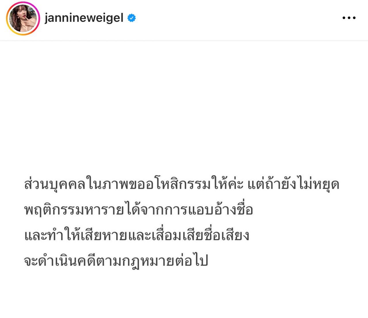 ส่วนบุคคลในภาพขออโหสิกรรมให้ค่ะ แต่ถ้ายังไม่หยุดพฤติกรรมหารายได้จากการแอบอ้างชื่อ และทำให้เสียหายและเสื่อมเสียชื่อเสียงจะดำเนินคดีตามกฎหมายต่อไป"