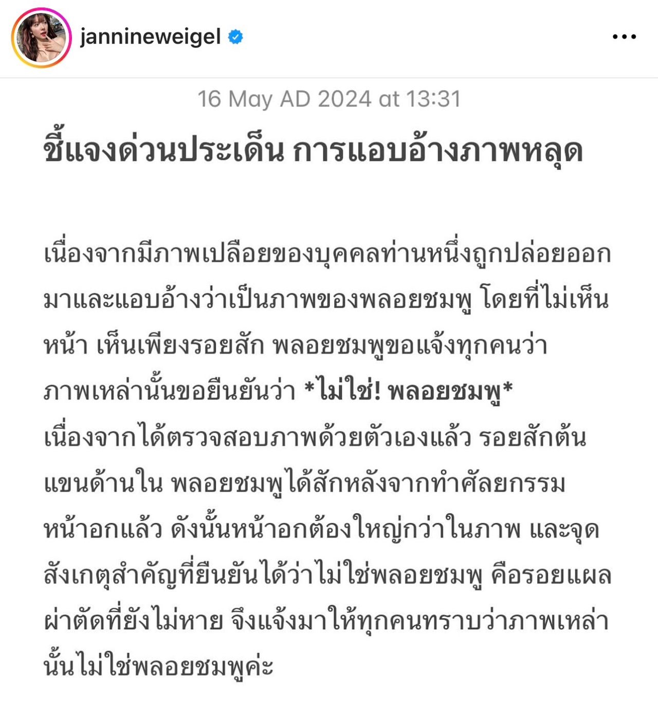 รอยสักต้นแขนด้านใน พลอยชมพูได้สักหลังจากทำศัลยกรรม หน้าอกแล้ว ดังนั้นหน้าอกต้องใหญ่กว่าในภาพ และจุด สังเกตสำคัญที่ยืนยันได้ว่าไม่ใช่พลอยชมพู คือรอยแผล ผ่าตัดที่ยังไม่หาย จึงแจ้งมาให้ทุกคนทราบว่าภาพเหล่า นั้นไม่ใช่พลอยชมพูค่ะ