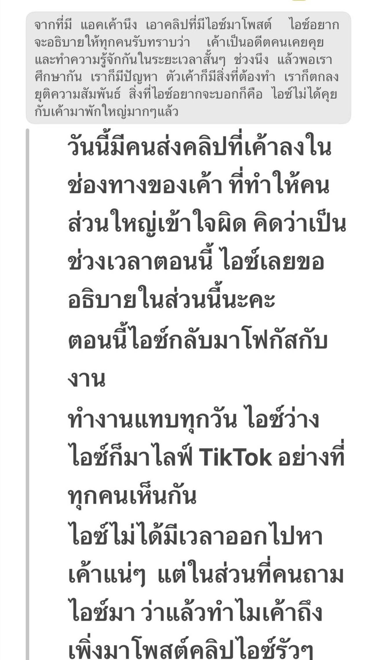 “วันนี้มีคนส่งคลิปที่เค้าลงในช่องทางของเค้า ทำให้คนส่วนใหญ่เข้าใจผิด คิดว่าเป็นช่วงเวลาตอนนี้ ไอซ์เลยขออธิบายในส่วนนี้นะคะ ตอนนี้ไอซ์กลับมาโฟกัสกับงาน ทำงานแทบทุกวัน