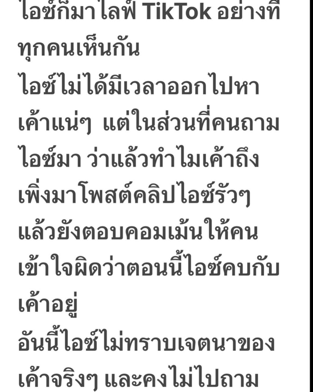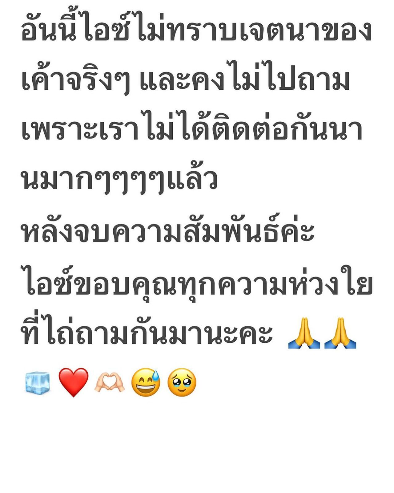 แล้วยังตอบคอมเมนต์ให้คนเข้าใจผิดว่าตอนนี้ไอซ์คบกับเค้าอยู่ อันนี้ไอซ์ไม่ทราบเจตนาของเค้าจริงๆ และคงไม่ไปถามเพราะเราไม่ได้ติดต่อกันมานานมากๆๆๆๆ แล้ว หลังจบความสัมพันธ์ค่ะ ไอซ์ขอบคุณทุกความห่วงใยที่ไถ่ถามกันมานะคะ”