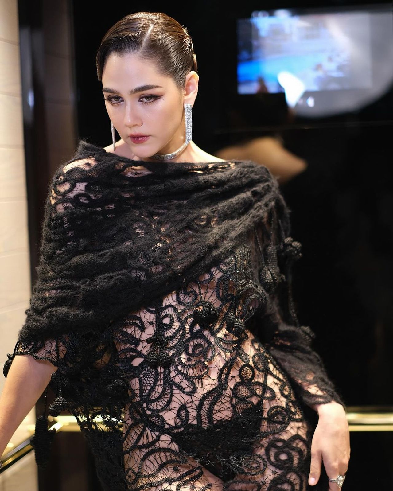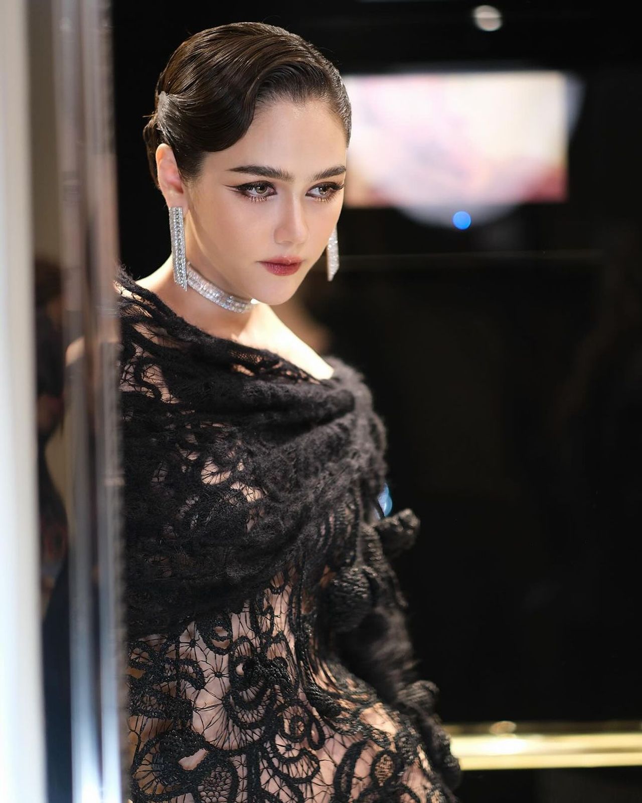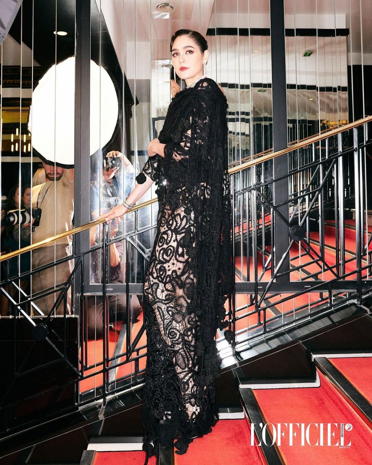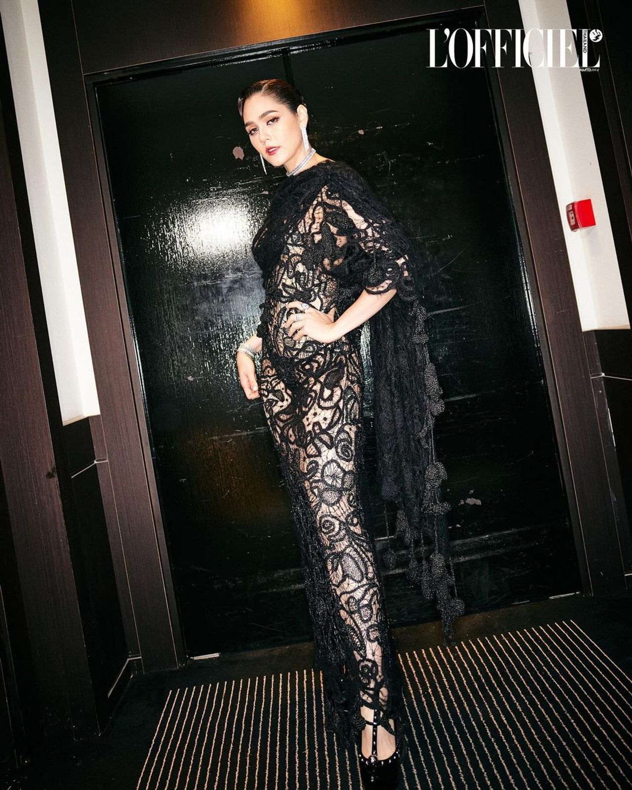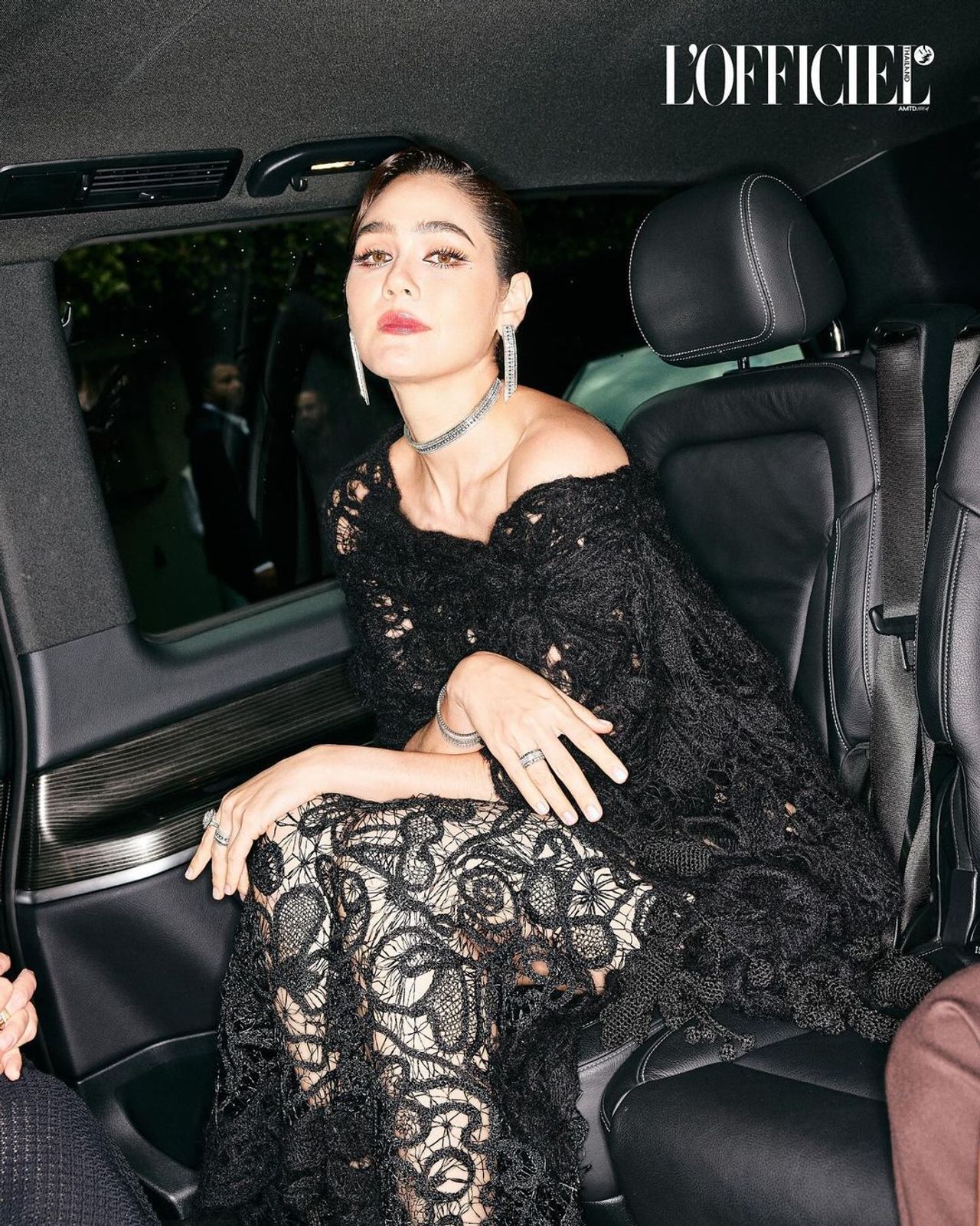 และลุควันที่ 3 ของชมพู่นั้น บอกเลยว่าปังสุดๆ ด้วยชุดลูกไม้โปร่งสีดำสุดเซ็กซี่จากแบรนด์ Maison Margiela มาสวมใส่ ซึ่งนี่คือผลงานของ จอห์น แกลลิอาโน (John Galliano) เสริมลุคให้สวยโดดเด่นด้วยเครื่องประดับคอลเลกชัน Quatre Radiant Edition จากแบรนด์ Boucheron