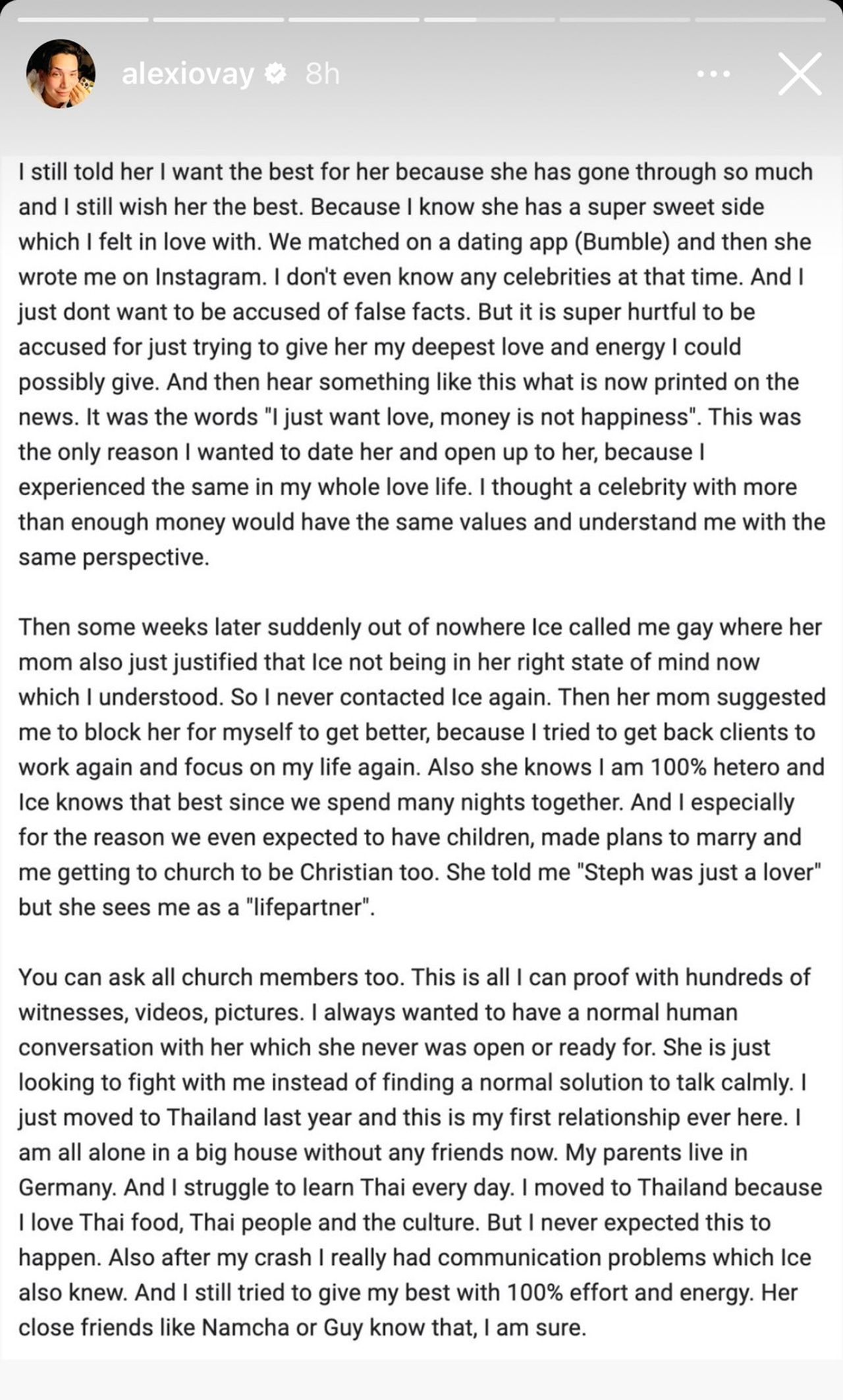 - เรารู้จักกันบนแอปฯ (Bumble) ไอซ์ทักมาทางอินสตาแกรม ตอนนั้นผมไม่รู้จักคนดังสักคนเลยด้วยซ้ำ ผมไม่อยากถูกกล่าวหาแบบผิดๆ แต่มันเจ็บปวดมากที่โดนกล่าวหาเพียงเพราะพยายามมอบความรักเท่าที่จะเป็นไปได้