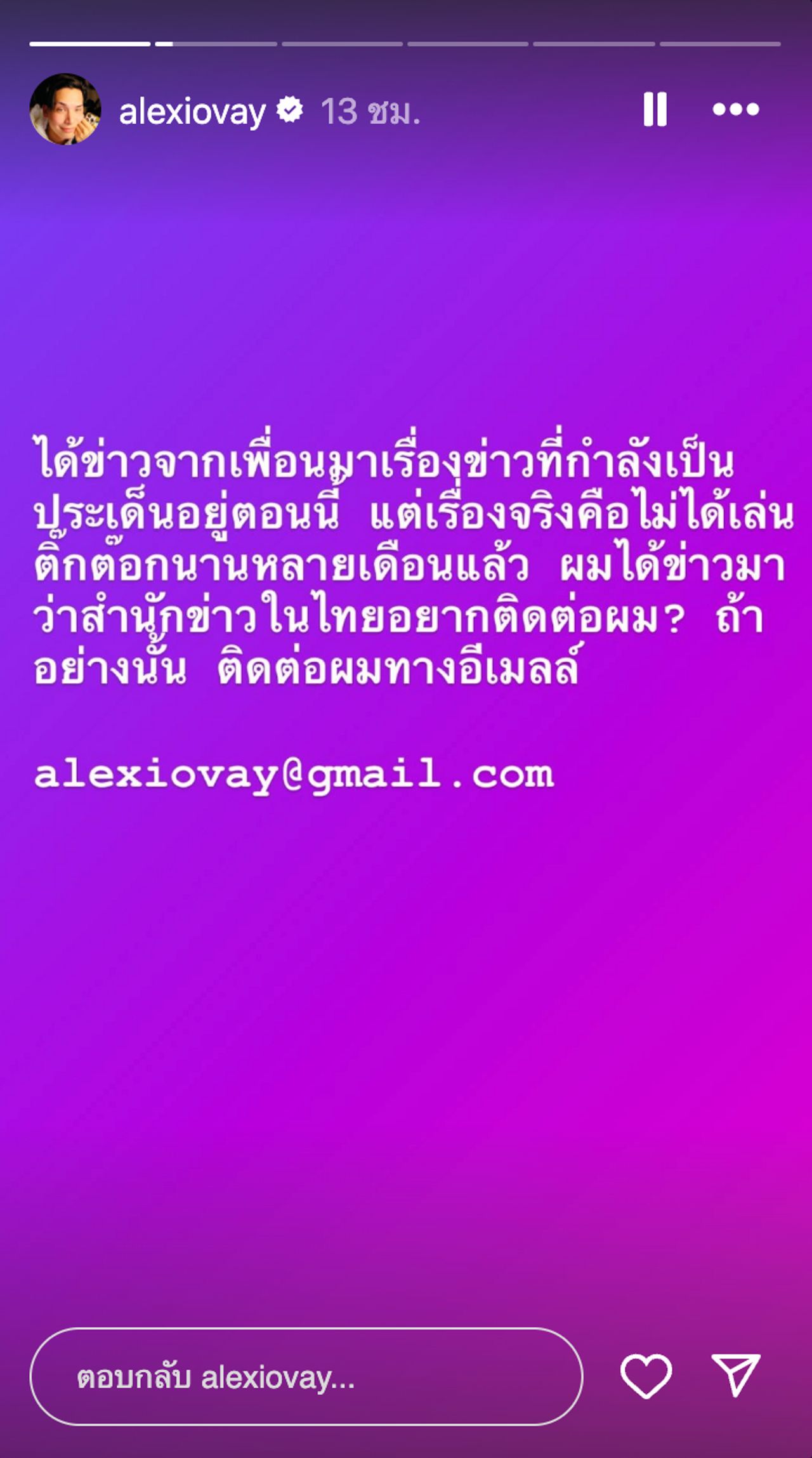 “ได้ข่าวจากเพื่อนมาเรื่องข่าวที่กำลังเป็นประเด็นอยู่ตอนนี้ แต่เรื่องจริงคือไม่ได้เล่นติ๊กต่อกนานหลายเดือนแล้ว ผมได้ข่าวมาว่าสำนักข่าวในไทยอยากติดต่อผม อย่างนั้นติดต่อผมทางอีเมล”