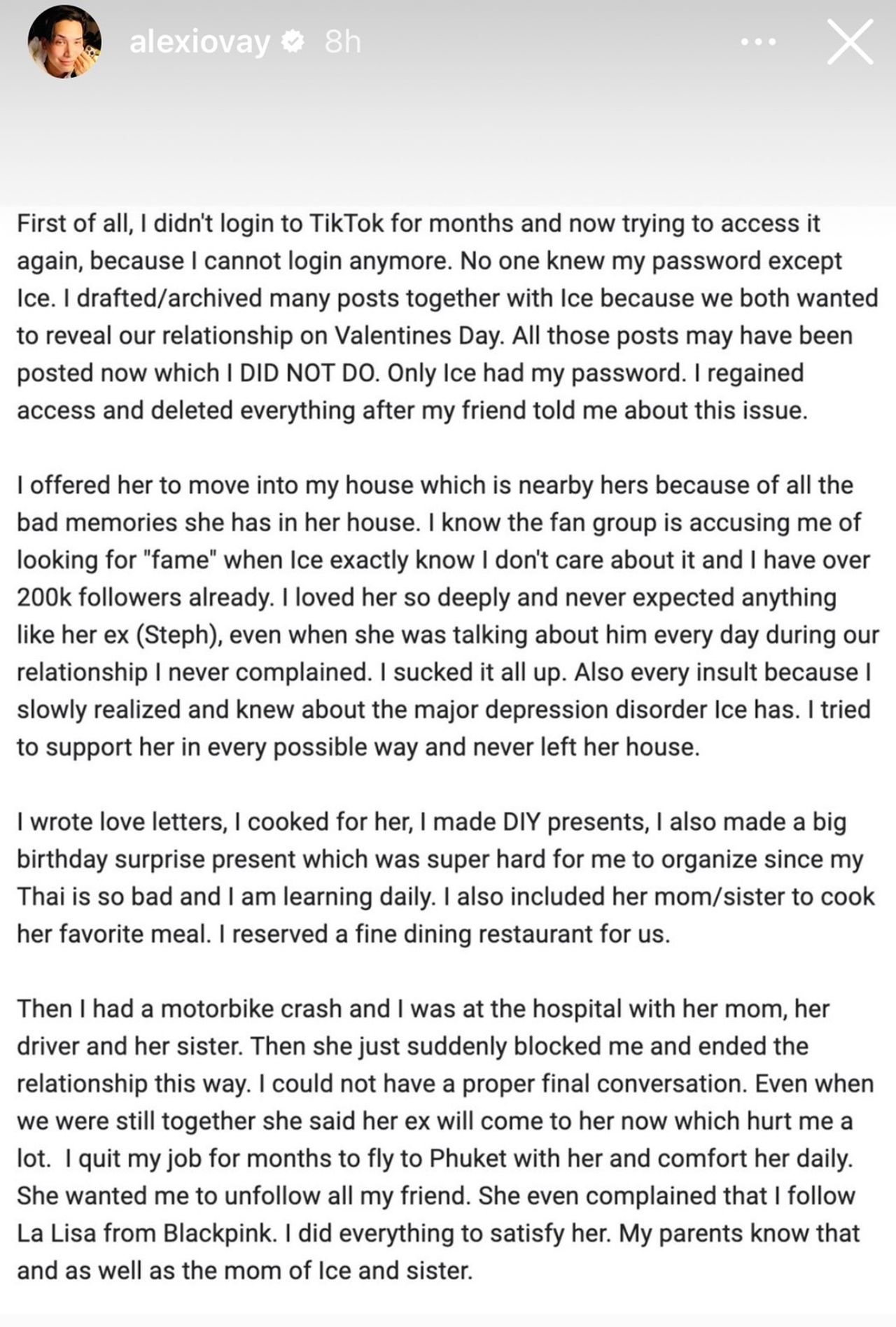 - ผมถ่ายกับไอซ์ไว้หลายโพสต์เพราะต้องการเปิดเผยความสัมพันธ์ในวันวาเลนไทน์ โพสต์เหล่านั้นอาจจะถูกโพสต์ไปแล้ว ซึ่งผมไม่ได้ทำ มีแค่ไอซ์ที่มีพาสเวิร์ด ผมเข้าไปใหม่และลบทุกอย่างหลังจากเพื่อนบอกผมว่ามีเรื่องนี้เกิดขึ้น