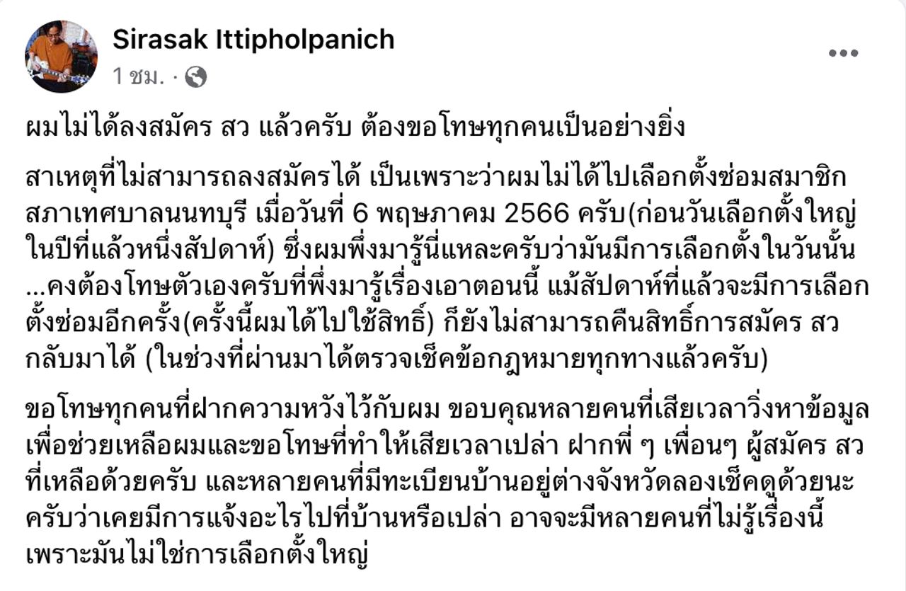 "ผมไม่ได้ลงสมัคร สว. แล้วครับ ต้องขอโทษทุกคนเป็นอย่างยิ่ง สาเหตุที่ไม่สามารถลงสมัครได้ เป็นเพราะว่าผมไม่ได้ไปเลือกตั้งซ่อมสมาชิกสภาเทศบาลนนทบุรี เมื่อวันที่ 6 พฤษภาคม 2566 ครับ (ก่อนวันเลือกตั้งใหญ่ในปีที่แล้วหนึ่งสัปดาห์)