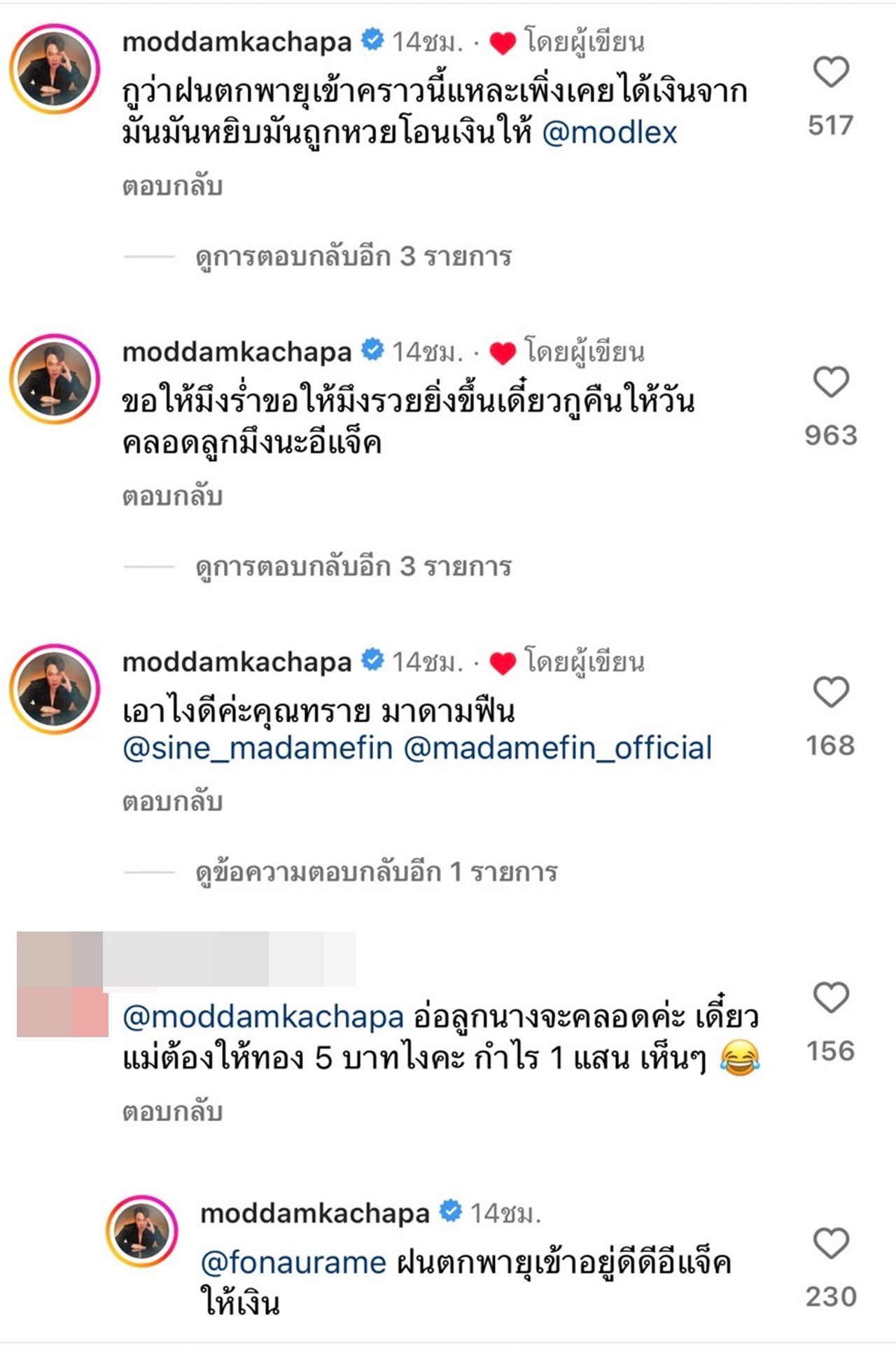 งานนี้ มดดำ เข้ามาคอมเมนต์ตอบ แจ็ค หลายคอมเมนต์เลยว่า "ขอให้มึงร่ำขอให้มึงรวยยิ่งขึ้นเดี๋ยวกูคืนให้วันคลอดลูกมึงนะอีแจ็ค, ฝนตกพายุเข้าอยู่ดีๆ อีแจ็คให้เงิน, กูว่าฝนตกพายุเข้าคราวนี้แหละเพิ่งเคยได้เงินจากมันมันหยิบมันถูกหวยโอนเงินให้"