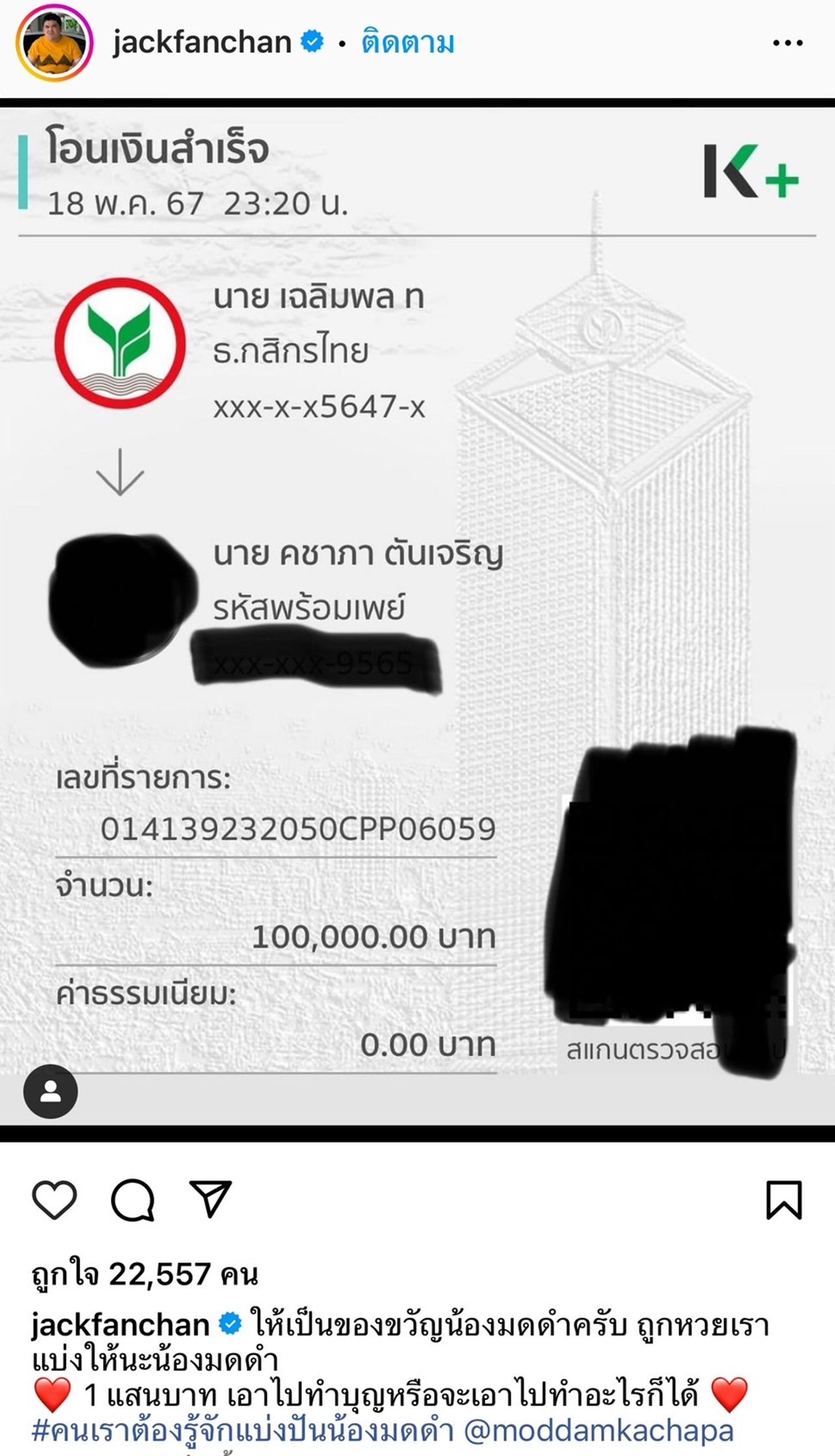 ล่าสุด แจ็ค แฟนฉัน ก็ยังได้โพสต์สลิปโอนเงินให้กับ มดดำ จำนวน 1 แสนบาท โดยบอกว่า