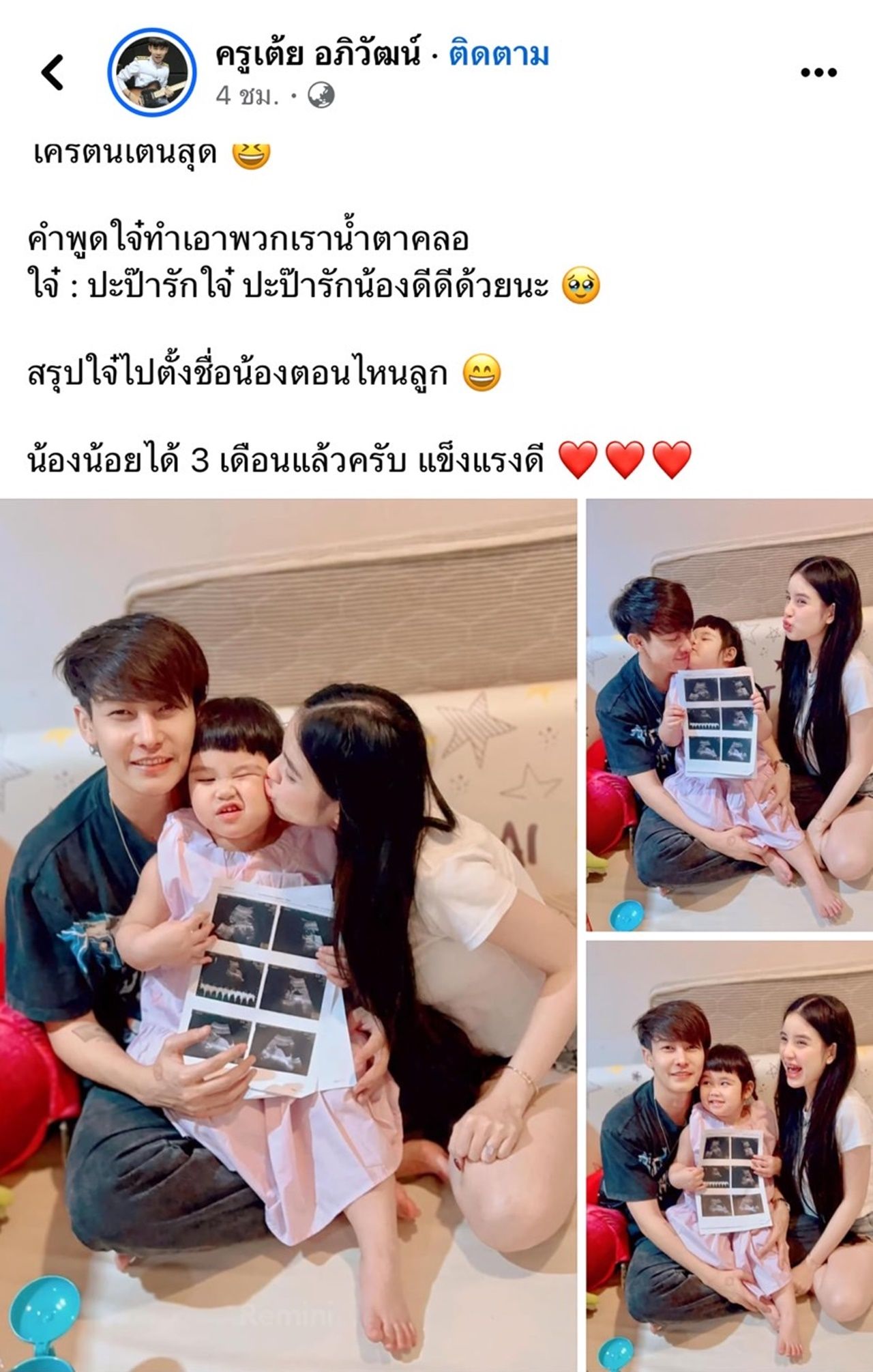 โดย ครูเต้ย ได้โพสต์ภาพอัลตราซาวนด์ลูกในท้อง และอยู่กันพร้อมหน้า 3 คนพ่อแม่ลูก พร้อมระบุว่า