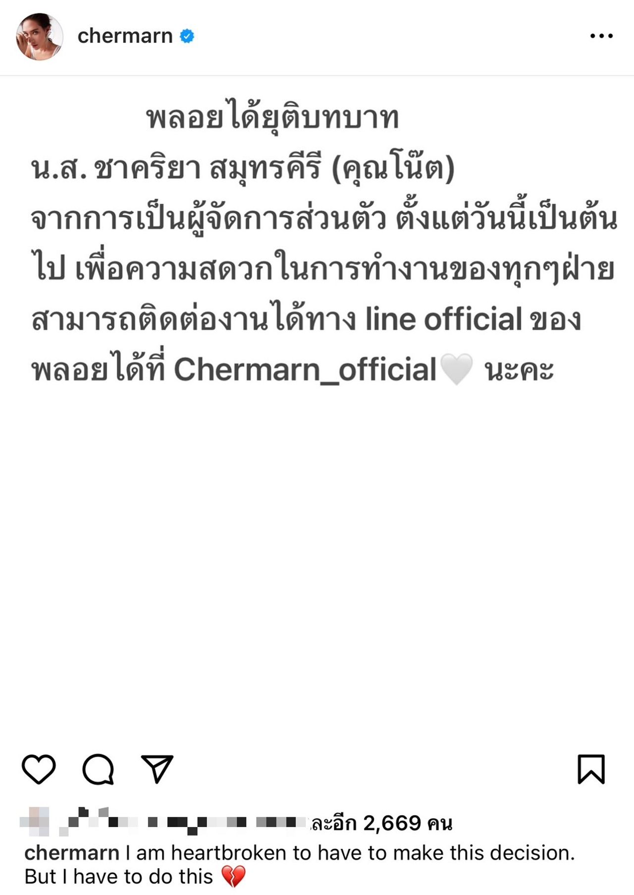 พร้อมระบุแคปชั่นว่า "chermarn I am heartbroken to have to make this decision. But I have to do this". ซึ่งแปลความหมายในทำนอง "อกหักที่ต้องตัดสินใจแบบนี้ แต่ฉันต้องทําแบบนี้"