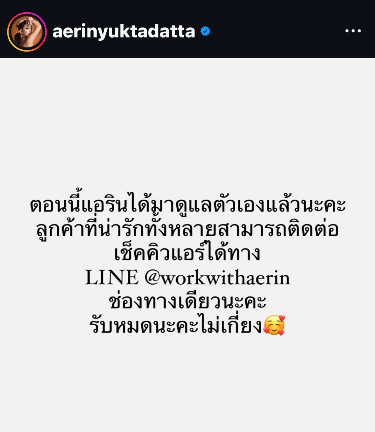 "ตอนนี้แอรินได้มาดูแลตัวเองแล้วนะคะ ลูกค้าที่น่ารักทั้งหลายสามารถติดต่อเช็คคิวแอร์ได้ทาง LINE @workwithaerin ช่องทางเดียวนะคะ