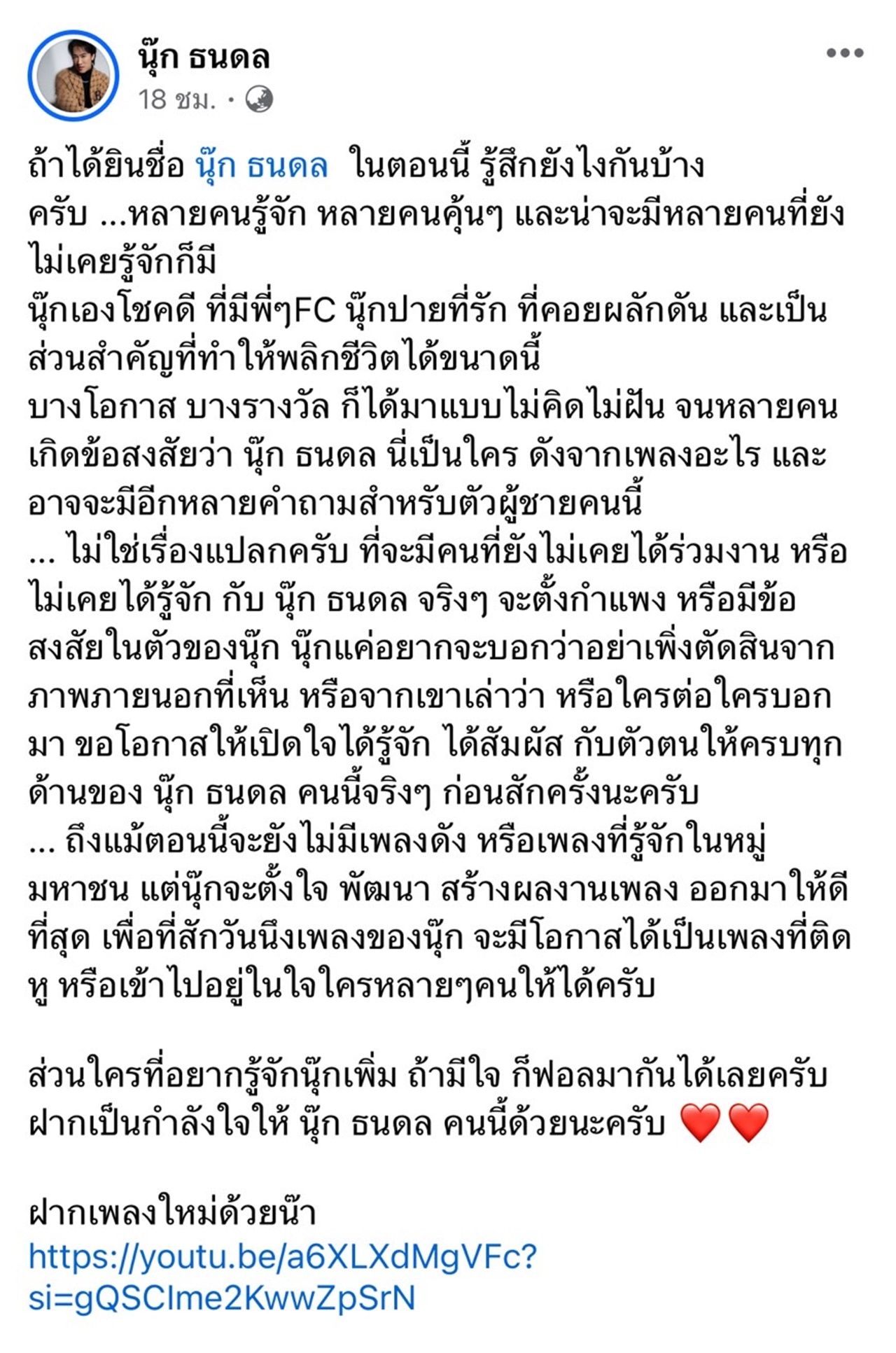 ส่วนใครที่อยากรู้จักนุ๊กเพิ่ม ถ้ามีใจ ก็ฟอลมากันได้เลยครับ ฝากเป็นกำลังใจให้ นุ๊ก ธนดล คนนี้ด้วยนะครับ"