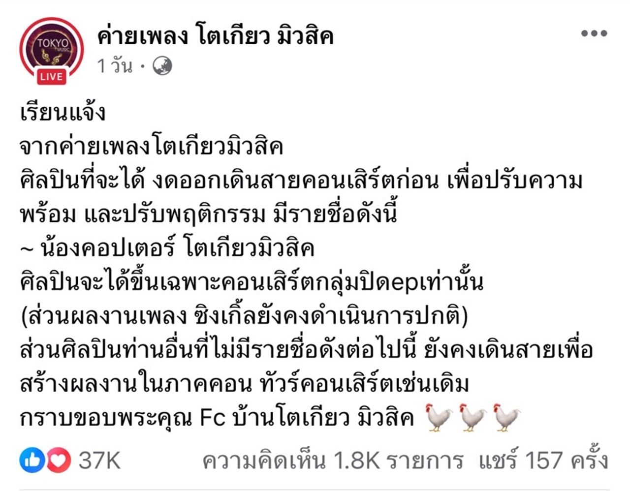 ก่อนหน้านี้ทางค่าย โตเกียว มิวสิค ได้โพสต์ข้อความสั่งพักงาน คอปเตอร์ โตเกียวมิวสิค ศิลปินเด็กในค่ายวัย 13 ปี งานนี้ทำเอาแฟนคลับบางคนต่างก็ไม่เห็นด้วยกับ บิ๊ก ผู้ใหญ่บ้านฟินแลนด์ จนเกิดดราม่าขึ้น