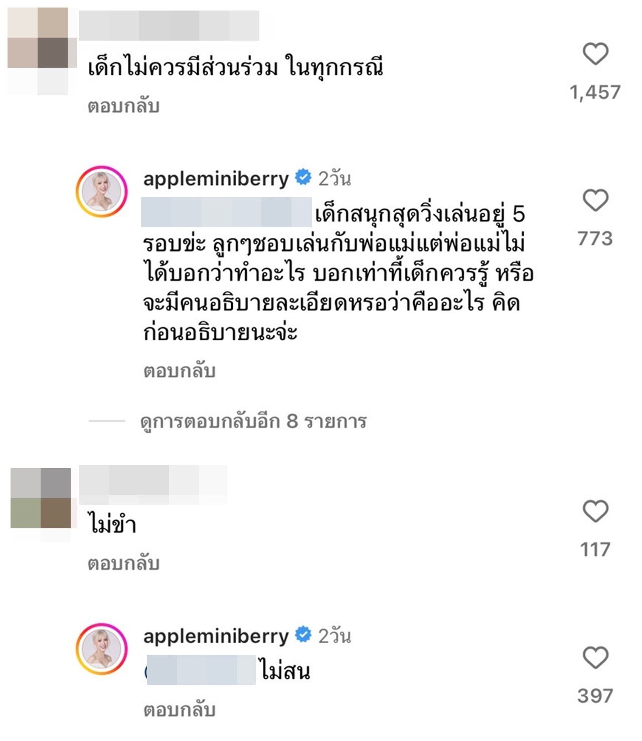 แต่งานนี้กลับมีดราม่า เมื่อมีชาวเน็ตบางส่วนไม่เห็นด้วยกับคอนเทนต์นี้ และเข้ามาติงกันจำนวนมาก อาทิ เด็กไม่ควรมีส่วนร่วม ในทุกกรณี และ แอปเปิ้ล ก็ได้เข้ามาตอบกลับบอกว่า "เด็กสนุกสุดวิ่งเล่นอยู่ 5 รอบข่ะ ลูกๆชอบเล่นกับพ่อแม่แต่พ่อแม่ไม่ได้บอกว่าทำอะไร บอกเท่าที้เด็กควรรู้ หรือจะมีคนอธิบายละเอียดหรอว่าคืออะไร คิดก่อนอธิบายนะจ่ะ" และยังมีคนเข้ามาคอมเมนต์ว่า "ไม่ขำ" แอปเปิ้ลตอบกลับว่า "ไม่สน"