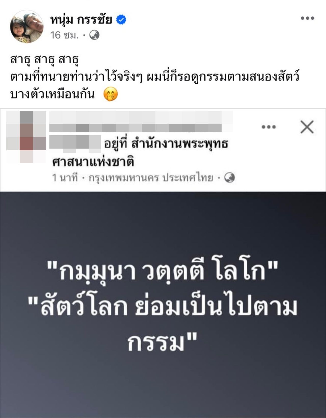 จากนั้น หนุ่ม กรรชัย ยังได้แคปข้อความของคู่กรณีที่ได้โพสต์เป็นภาษาบาลีว่า "กมฺมุนา วตฺตตี โลโก สัตว์โลกย่อมเป็นไปตามกรรม" และได้เขียนข้อความว่า "สาธุ สาธุ สาธุ ตามที่ทนายท่านว่าไว้จริงๆ ผมนี่ก็รอดูกรรมตามสนองสัตว์บางตัวเหมือนกัน".