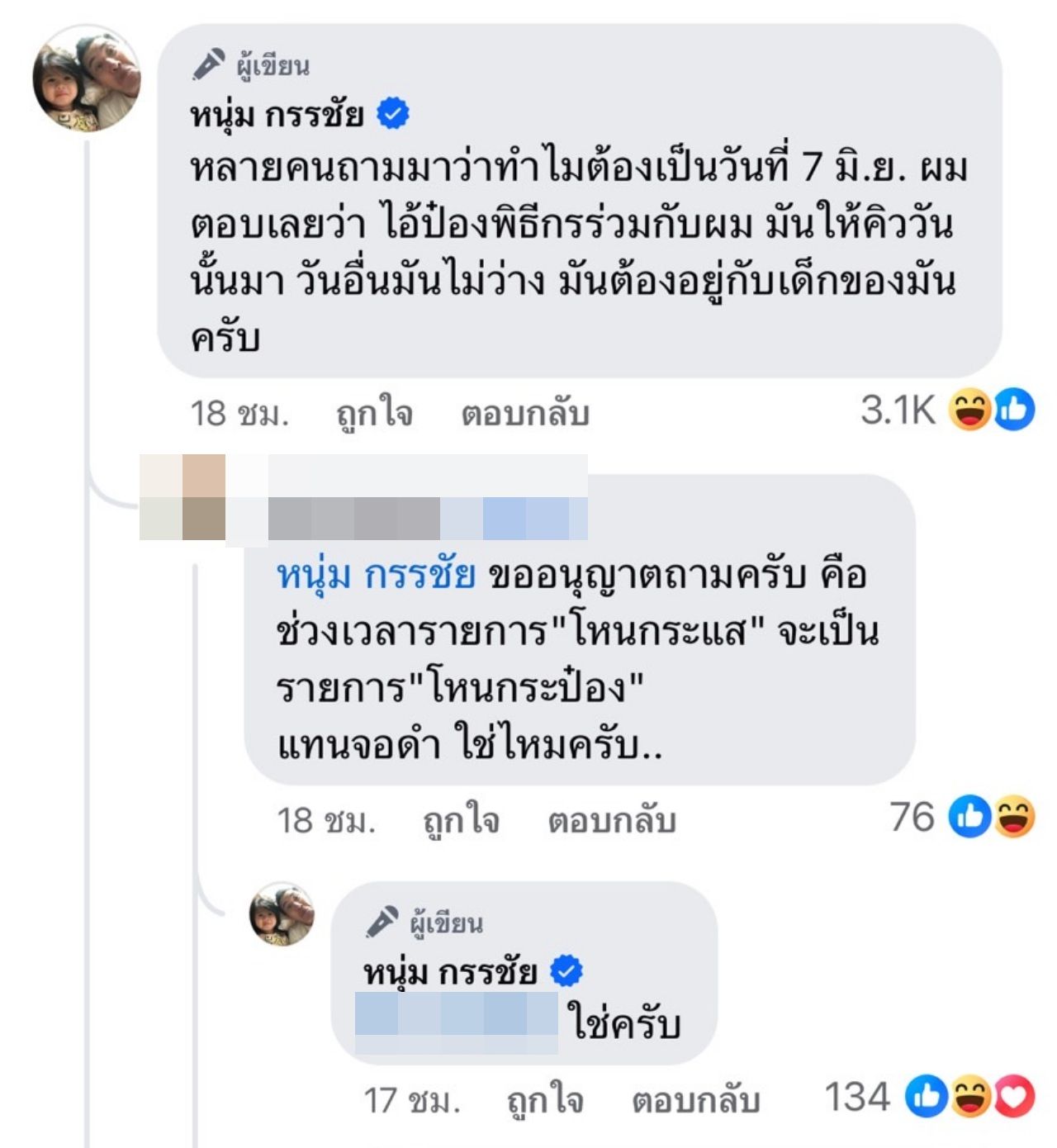 หลังจากที่ หนุ่ม กรรชัย ได้โพสต์ข้อความดังกล่าว หลายคนที่ติดตามต่างก็สงสัยอย่างมากว่า ทำไมต้องเป็นวันที่ 7 มิ.ย. ซึ่ง หนุ่ม เองก็ได้เข้ามาคอมเมนต์อธิบาย บอกว่า