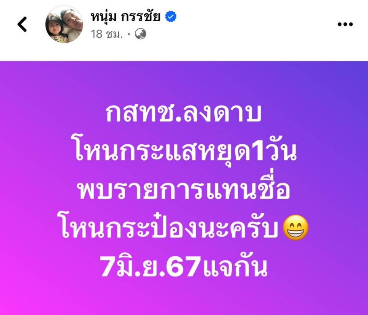 ซึ่งเรื่องนี้ทางด้าน หนุ่ม กรรชัย เองก็ได้โพสต์ข้อความบอกว่า "กสทช.ลงดาบ โหนกระแสหยุด 1 วัน พบรายการแทนชื่อ โหนกระป๋องนะครับ 7 มิ.ย.67 แจกัน"