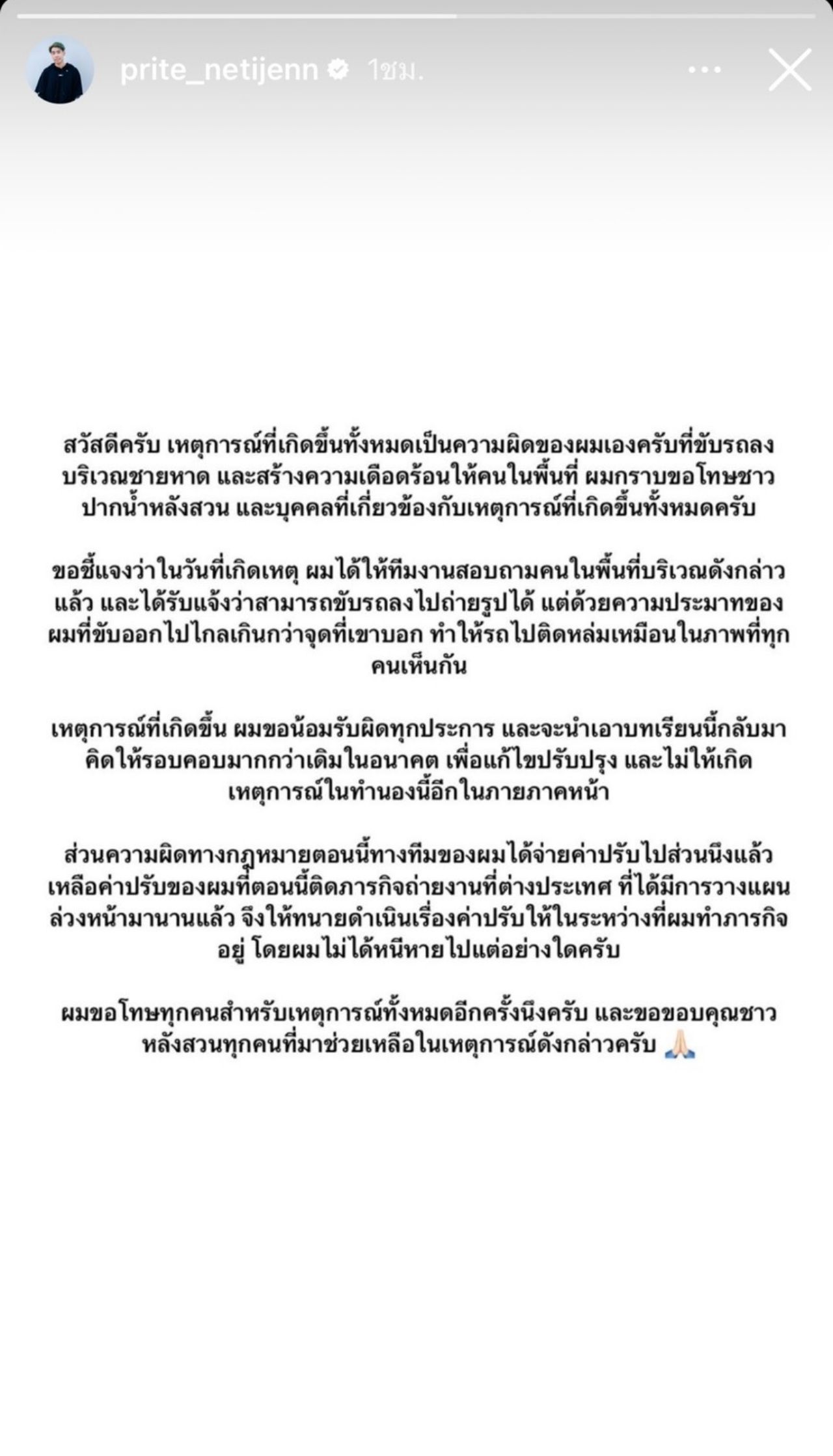 "สวัสดีครับ เหตุการณ์ที่เกิดขึ้นทั้งหมดเป็นความผิดของผมเองครับที่ขับรถลงบริเวณชายหาด และสร้างความเดือดร้อนให้คนในพื้นที่ ผมกราบขอโทษชาวปากน้ำหลังสวน และบุคคลที่เกี่ยวข้องกับเหตุการณ์ที่เกิดขึ้นทั้งหมดครับ