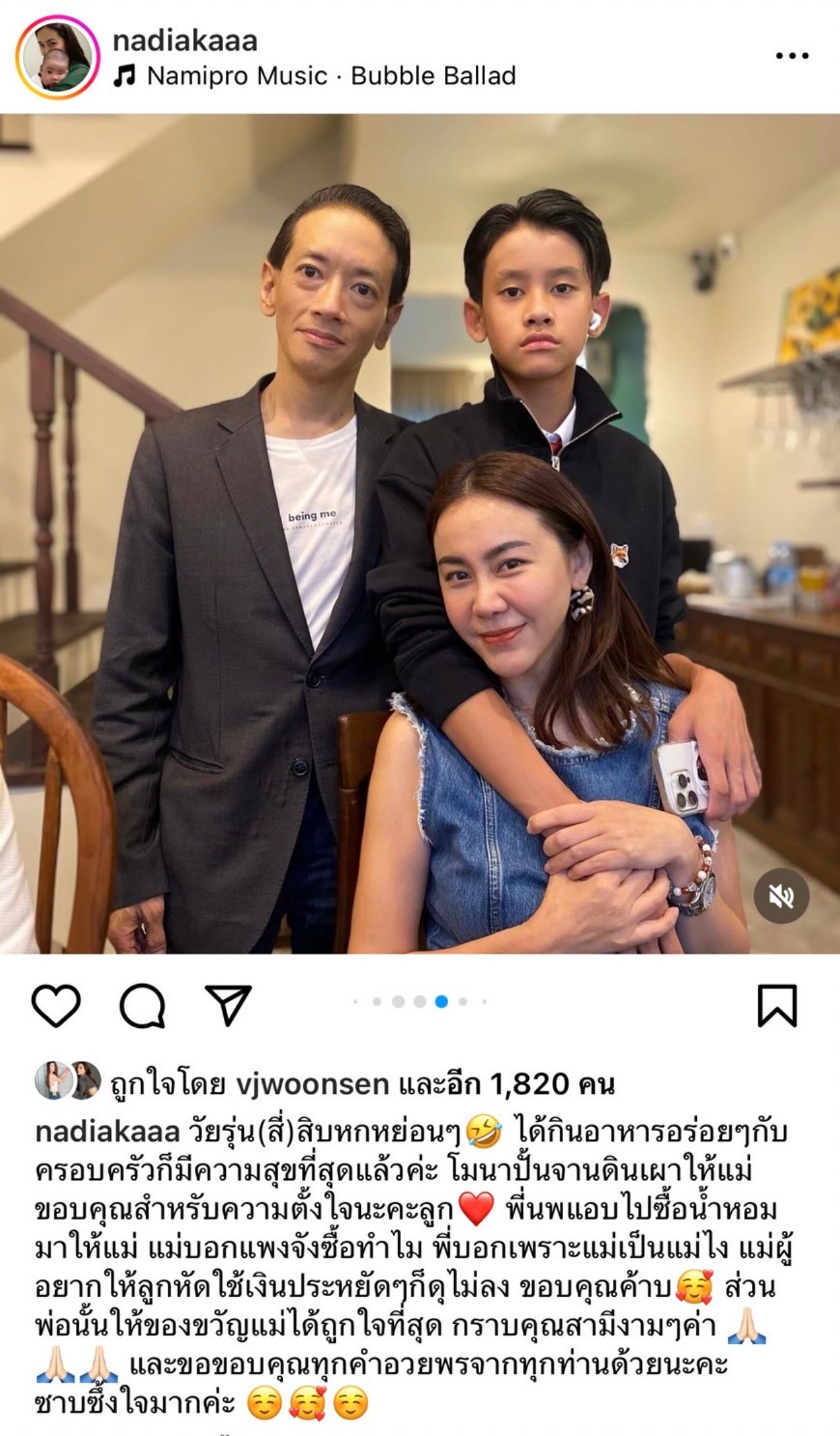 นอกจากจะมีเค้กแล้ว ยังมีของขวัญสุดประทับใจจากสามี ที่เตรียมมาให้ภรรยาคนสวยด้วยตัวเอง ซึ่ง นาเดีย บอกว่า ถูกใจแม่มาก กราบขอบคุณงามๆ ยังได้น้ำหอมจากลูกชาย ที่แอบไปซื้อของแพงมาให้คุณแม่โดยเฉพาะ บอกเลยว่า ครอบครัวนี้อบอุ่นและน่ารักมากทีเดียว โดยคุณแม่นาเดียได้โพสต์ภาพ พร้อมเขียนข้อความว่า