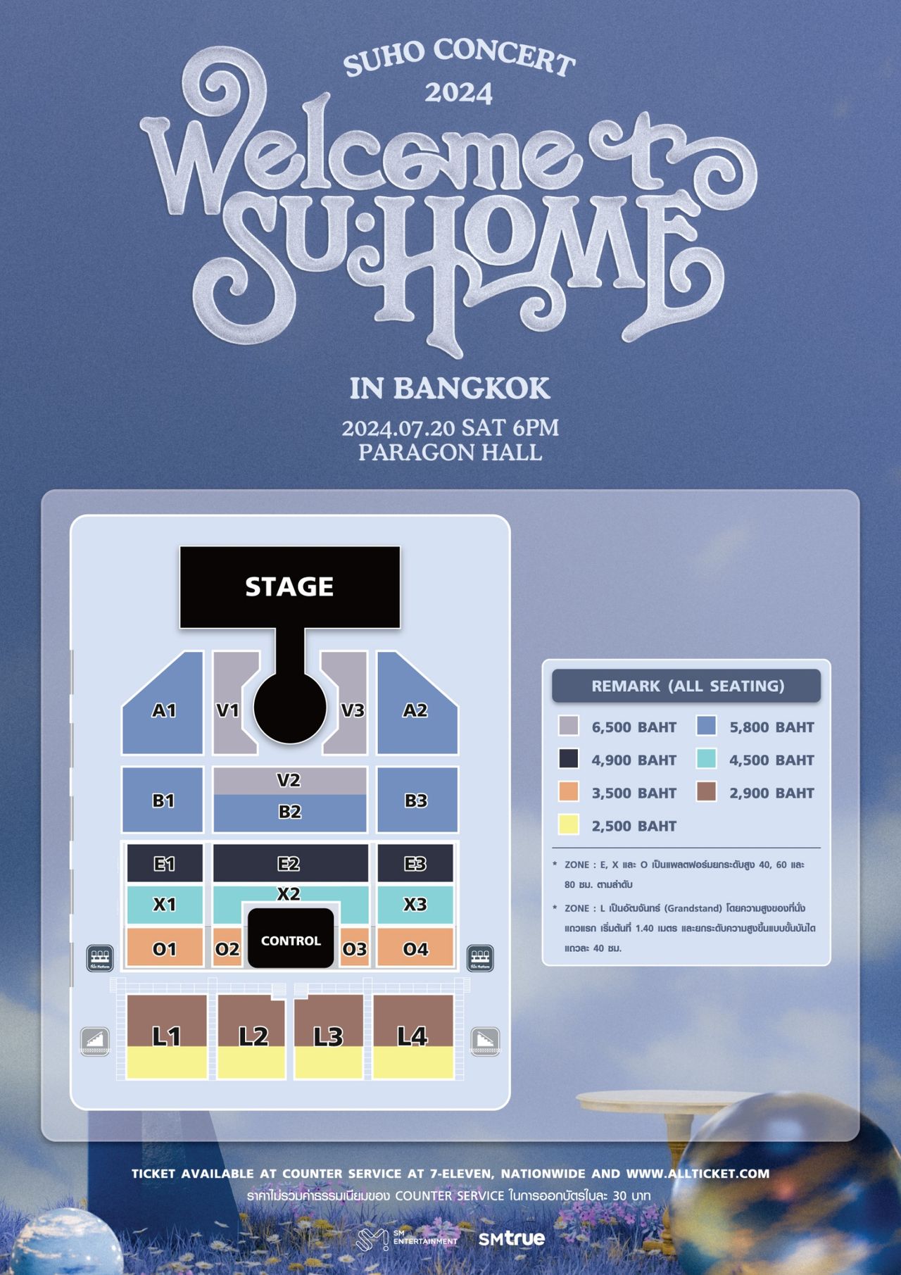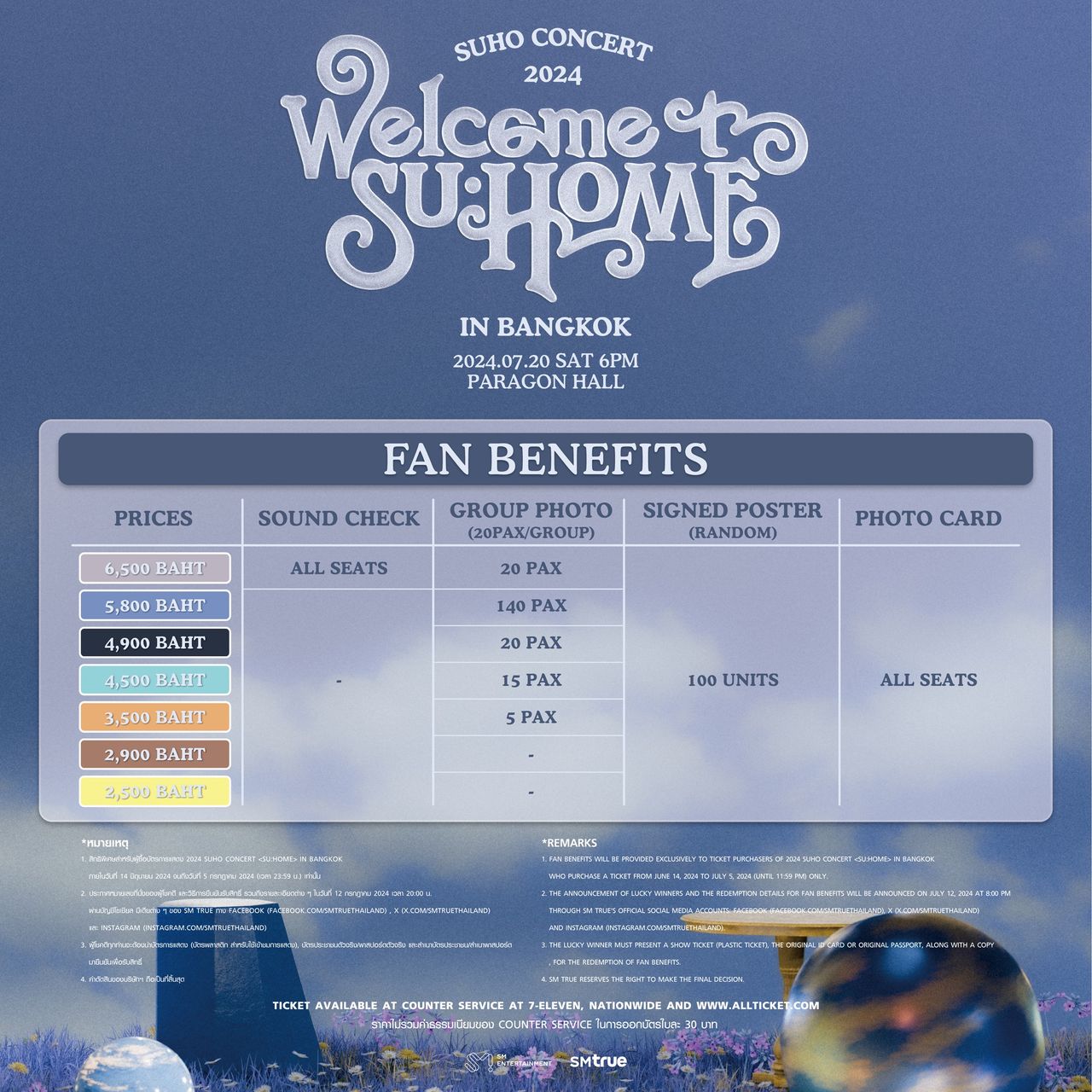 เปิดจำหน่ายบัตรรอบ “EXO-L” Membership (GL) Pre-Sale ในวันศุกร์ที่ 14 มิถุนายน 2567 เวลา 19.00-20.59 น. ทางเว็บไซต์เท่านั้น และรอบบุคคลทั่วไป ในวันอาทิตย์ที่ 16 มิถุนายน 2567 ตั้งแต่เวลา 11.00 น. เป็นต้นไป ทางเคาน์เตอร์เซอร์วิสในร้าน 7-Eleven ทุกสาขาทั่วประเทศ และทางเว็บไซต์ www.allticket.com/event/SUHO_SUHOMEinBKK บัตรราคา 6,500 / 5,800 / 4,900 / 4,500 / 3,500 / 2,900 / 2,500 บาท (บัตรนั่งทั้งหมด) พร้อมสิทธิพิเศษสำหรับผู้ซื้อบัตร ติดตามข่าวสารและรายละเอียดเพิ่มเติมได้ทางบัญชีโซเชียลมีเดียต่างๆ ของ SM True : เฟซบุ๊ก facebook.com/smtruethailand, อินสตาแกรม instagram.com/smtruethailand และเอ็กซ์ x.com/SMTrueThailand สอบถามข้อมูลเพิ่มเติมเกี่ยวกับการซื้อบัตรได้ที่ Counter Service Call Center 0-2826-7788