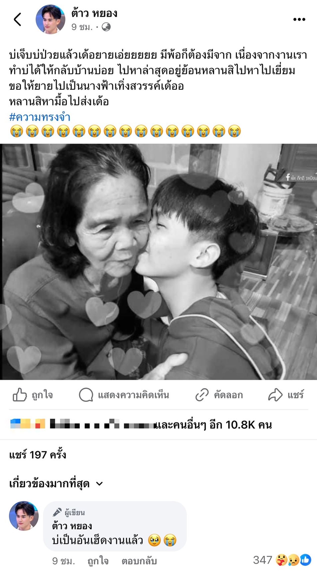 โดย ต้าวหยอง ได้โพสต์บนเฟซบุ๊กส่วนตัวว่าจะต้องรีบไปส่งยาย ข้อความดังกล่าวระบุว่า "บ่เจ็บบ่ป่วยแล้วเด้อยายเอ่ยยยยย มีพ้อก็ต้องมีจาก เนื่องจากงานเราทำบ่ได้ให้กลับบ้านบ่อย ไปหาล่าสุดอยู่ย้อนหลานสิไปหาไปเยี่ยม ขอให้ยายไปเป็นนางฟ้าเทิ่งสวรรค์เด้อ หลานสิหามื้อไปส่งเด้อ #ความทรงจำ"