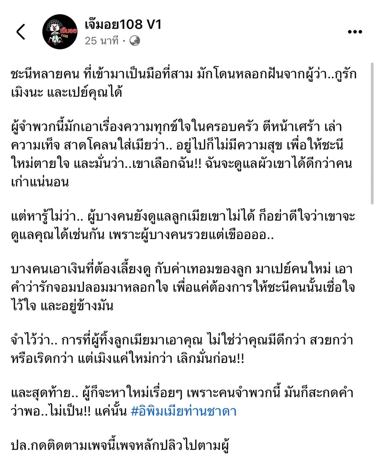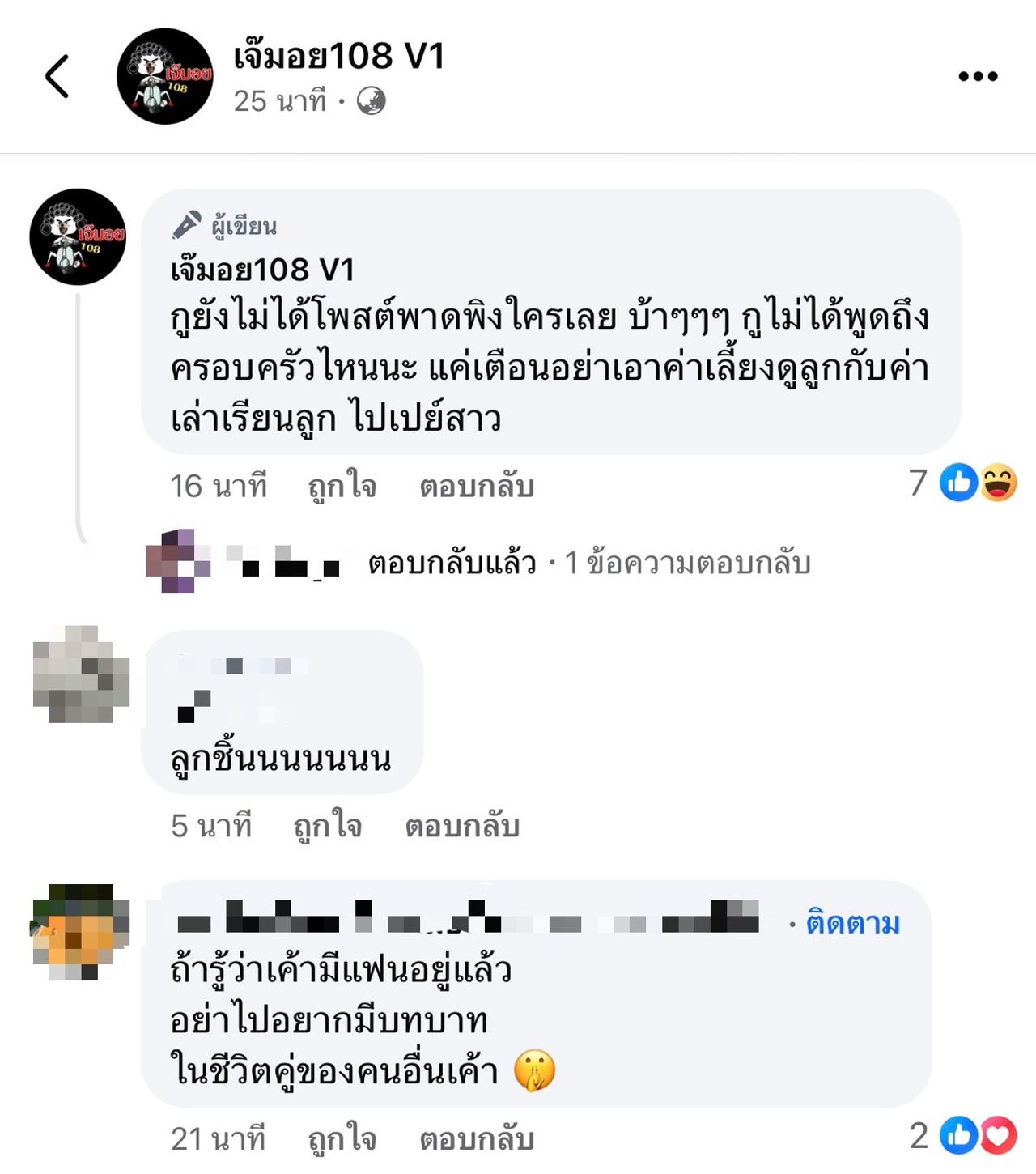และยังคอมเมนต์ใต้โพสต์ดังกล่าวว่า "กูยังไม่ได้โพสต์พาดพิงใครเลย บ้าๆๆๆ กูไม่ได้พูดถึงครอบครัวไหนนะ แค่เตือนอย่าเอาค่าเลี้ยงดูลูกกับค่าเล่าเรียนลูก ไปเปย์สาว"