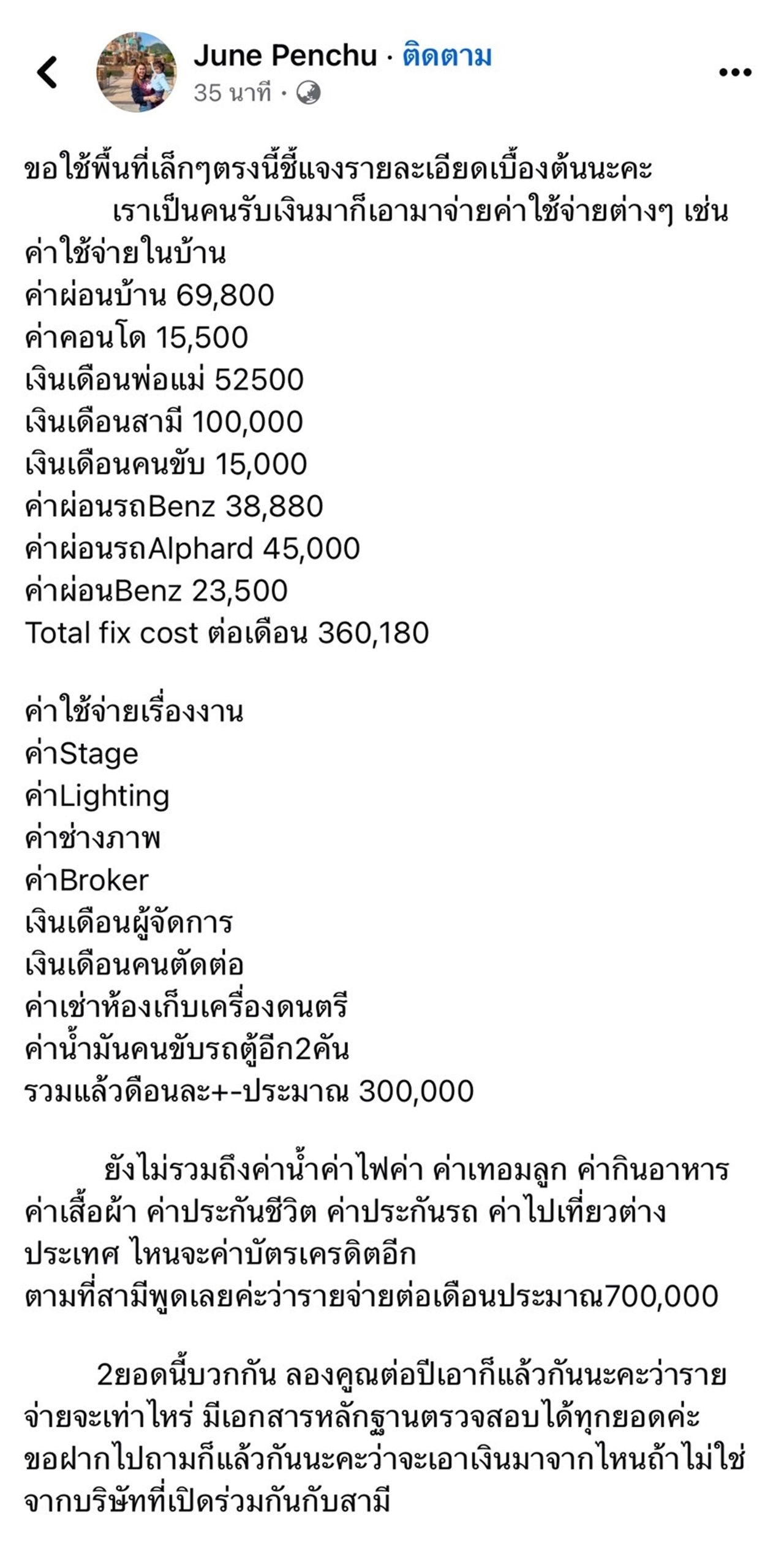 ล่าสุด จูน ก็ได้ขอใช้พื้นที่โซเชียลชี้แจงในมุมตัวเอง พร้อมกับแจงค่าใช้จ่ายทั้งหมดในแต่ละเดือนว่าต้องจ่ายอะไรบ้าง ซึ่งมีทั้งค่าใช้จ่ายในบ้าน และค่าใช้จ่ายเกี่ยวกับเรื่องงานของ หนุ่ม กะลา ทั้ง 2 ยอดรวมกันประมาณ 700,000 บาท