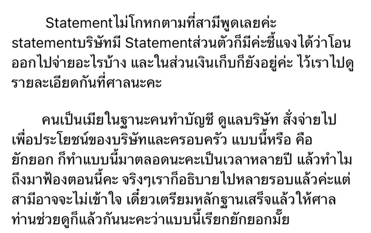 Statement ไม่โกหกตามที่สามีพูดเลยค่ะ Statement บริษัทมี Statement ส่วนตัวก็มีค่ะ ชี้แจงได้ว่าโอนออกไปจ่ายอะไรบ้าง และในส่วนเงินเก็บก็ยังอยู่ค่ะ ไว้เราไปดูรายละเอียดกันที่ศาลนะคะ