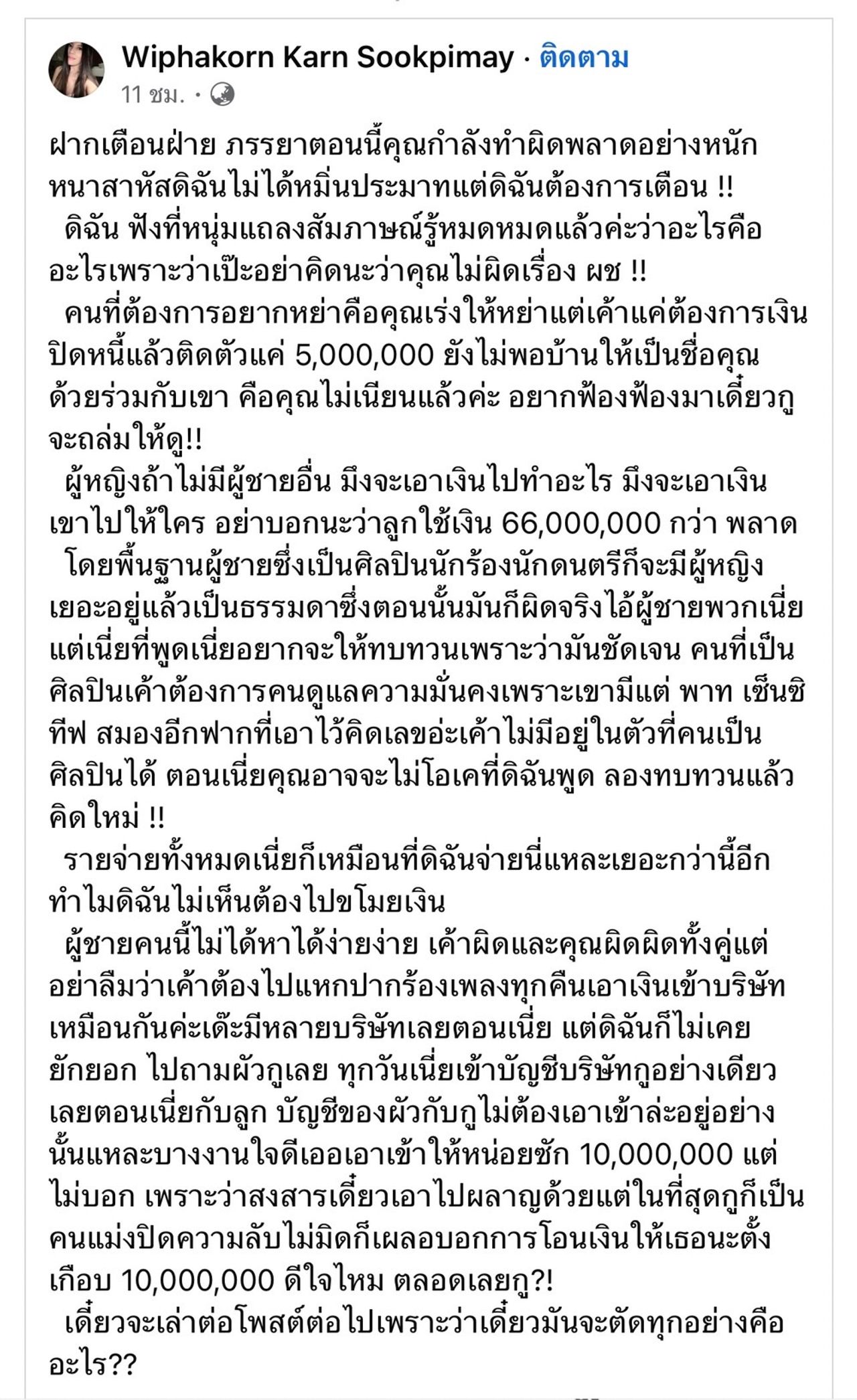 โดยเจ้าตัวโพสต์ผ่านเฟซบุ๊กว่า "ฝากเตือนฝ่ายภรรยาตอนนี้คุณกำลังทำผิดพลาดอย่างหนักหนาสาหัสดิฉันไม่ได้หมิ่นประมาทแต่ดิฉันต้องการเตือน !!