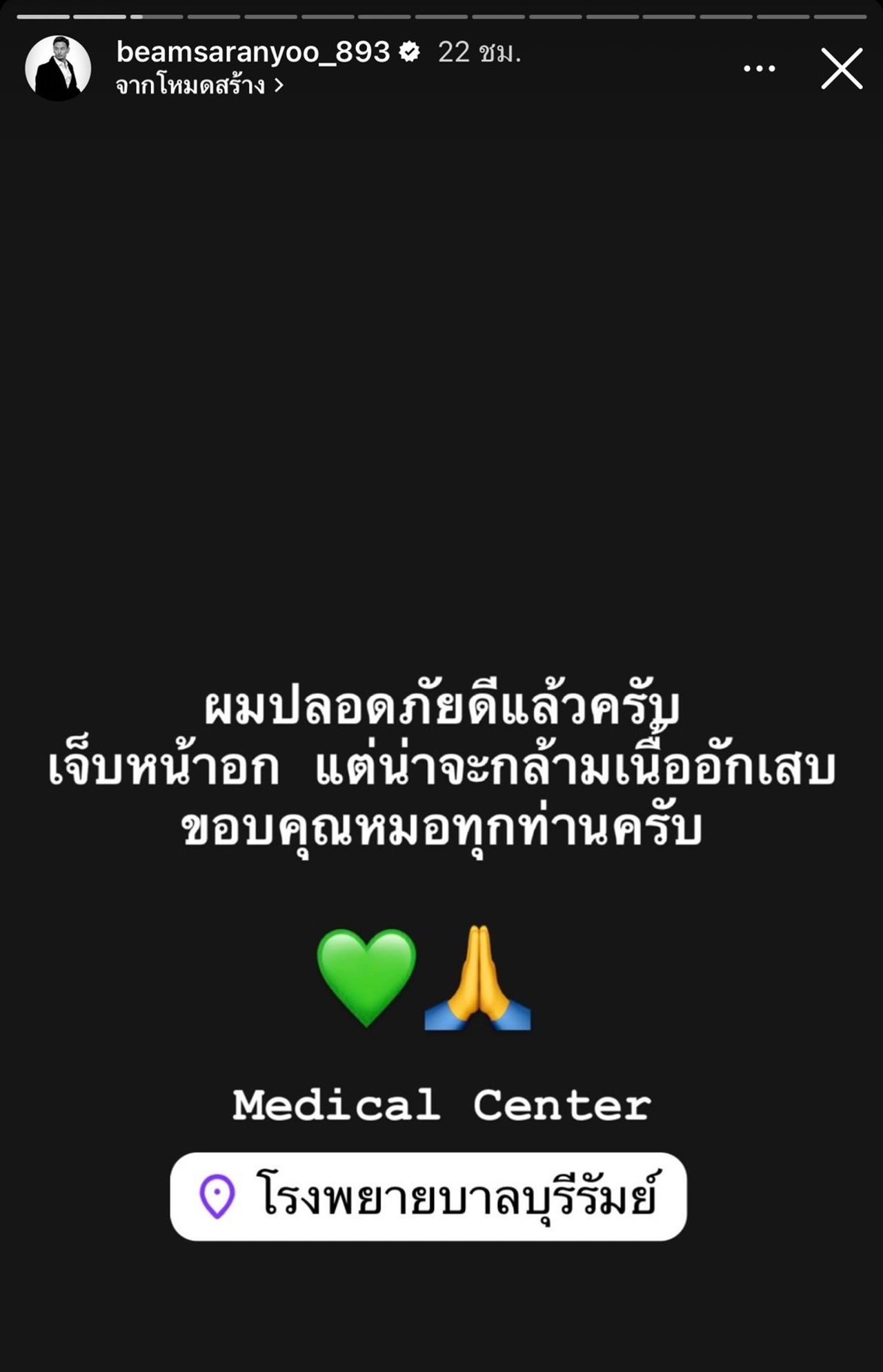 ล่าสุด หนุ่มบีม ได้อัปเดตอาการผ่านไอจีสตอรี่ โดยระบุว่า "ผมปลอดภัยดีแล้วครับ เจ็บหน้าอก แต่น่าจะกล้ามเนื้ออักเสบ ขอบคุณหมอทุกท่านครับ Medical Center โรงพยายบาลบุรีรัมย์".